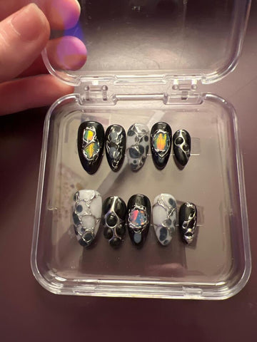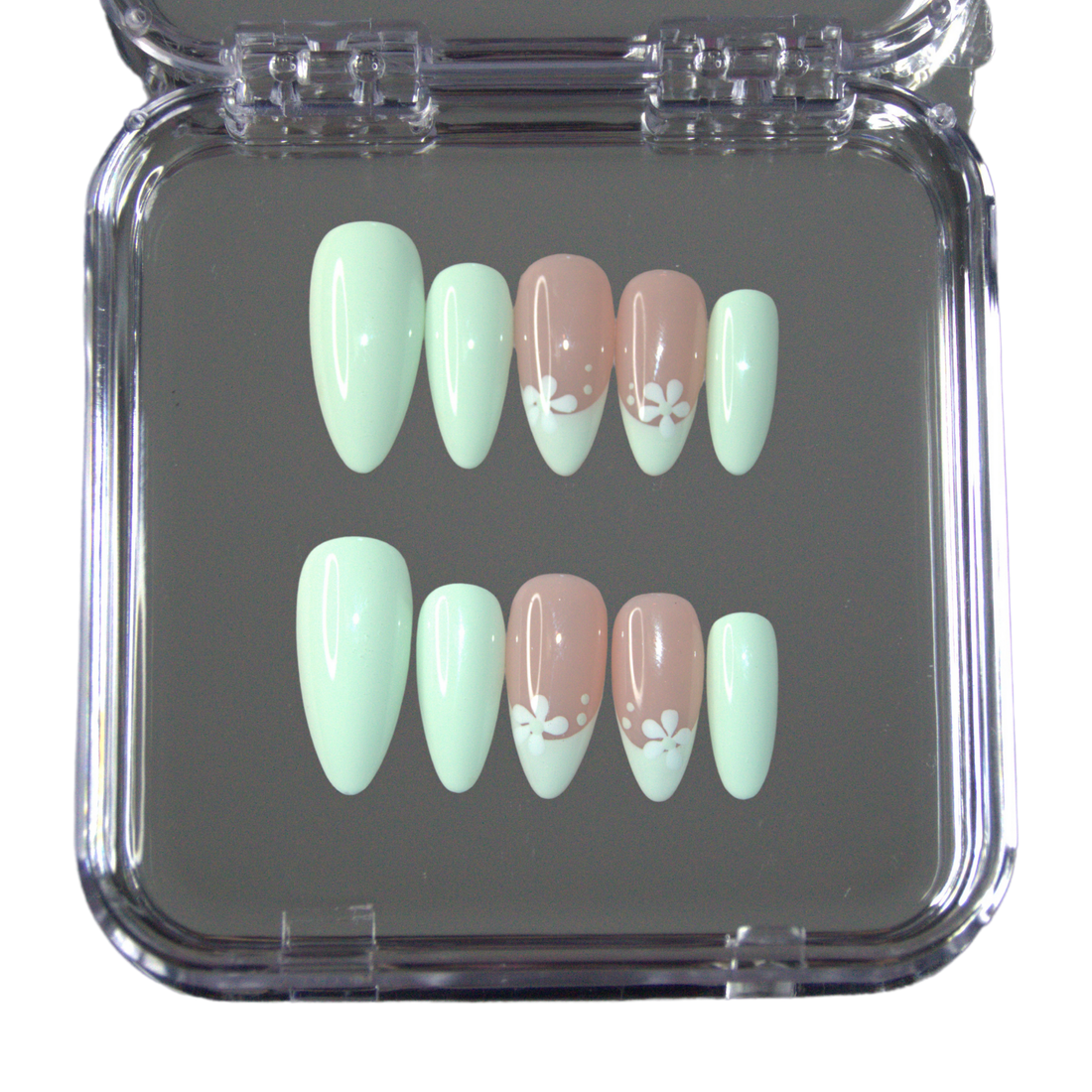 Les modèles faits main, comme chez Mimi, sont plus solides, plus épais et offrent des finitions uniques et travaillés. Les press-on industriels sont souvent plus fragiles et moins détaillés. Pour les reconnaitre, les press-on nails faits machine ont souvent un bout de plastique à l'extrémité de l'ongle qu'il faut limer.