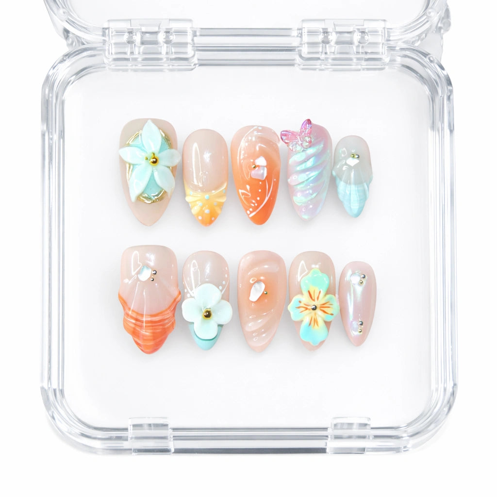 Handmade press-on false nails in gel and acrylic in shades of blue, orange, and nude, embellished with floral details and raised decorations. A design that evokes the ocean and seaside holidays.