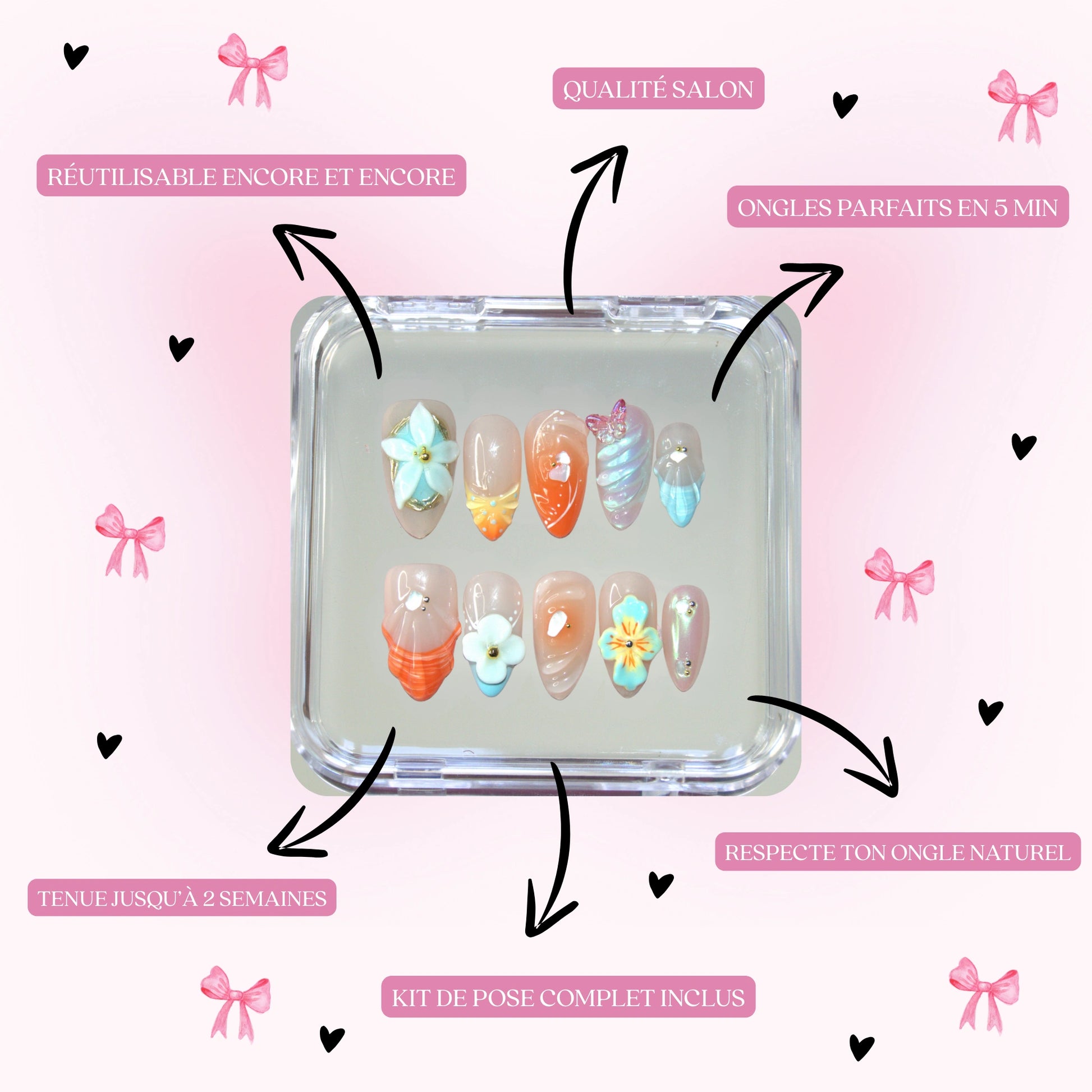 It depends on the method you choose: with gel pads, count 5 to 7 days: perfect for an event or everyday use. With glue, your false nails can last up to 14 days, depending on your daily routine. And the best part? You can take them off whenever you want and reuse them as much as you want, just peel them off carefully 🌸