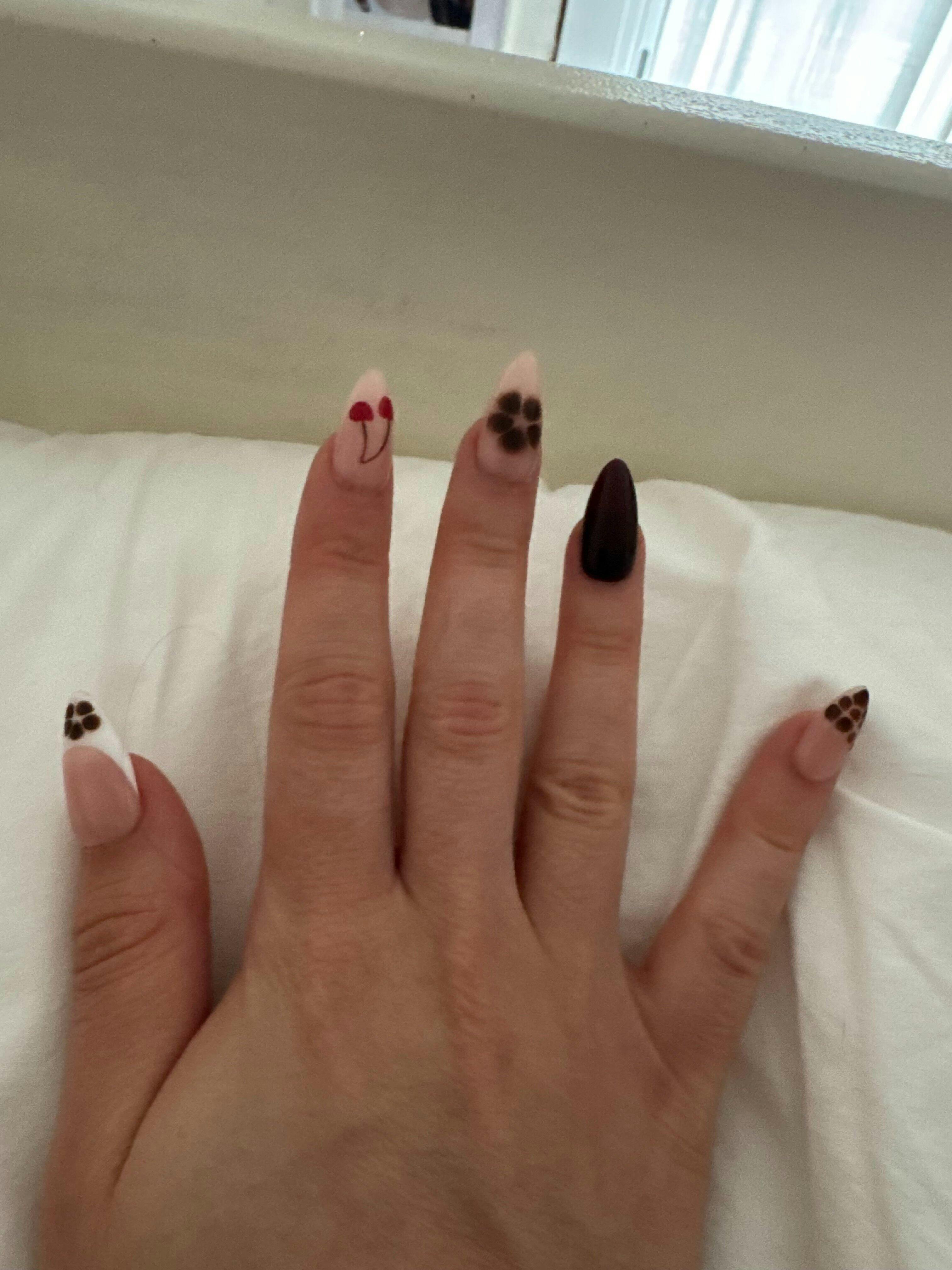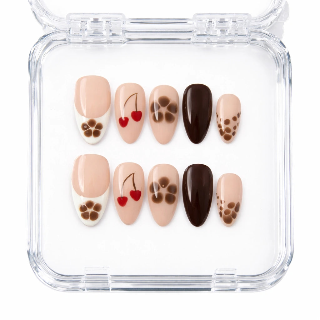 Handmade press-on false nails in nude and brown gel and acrylic, decorated with floral patterns and red cherries.
