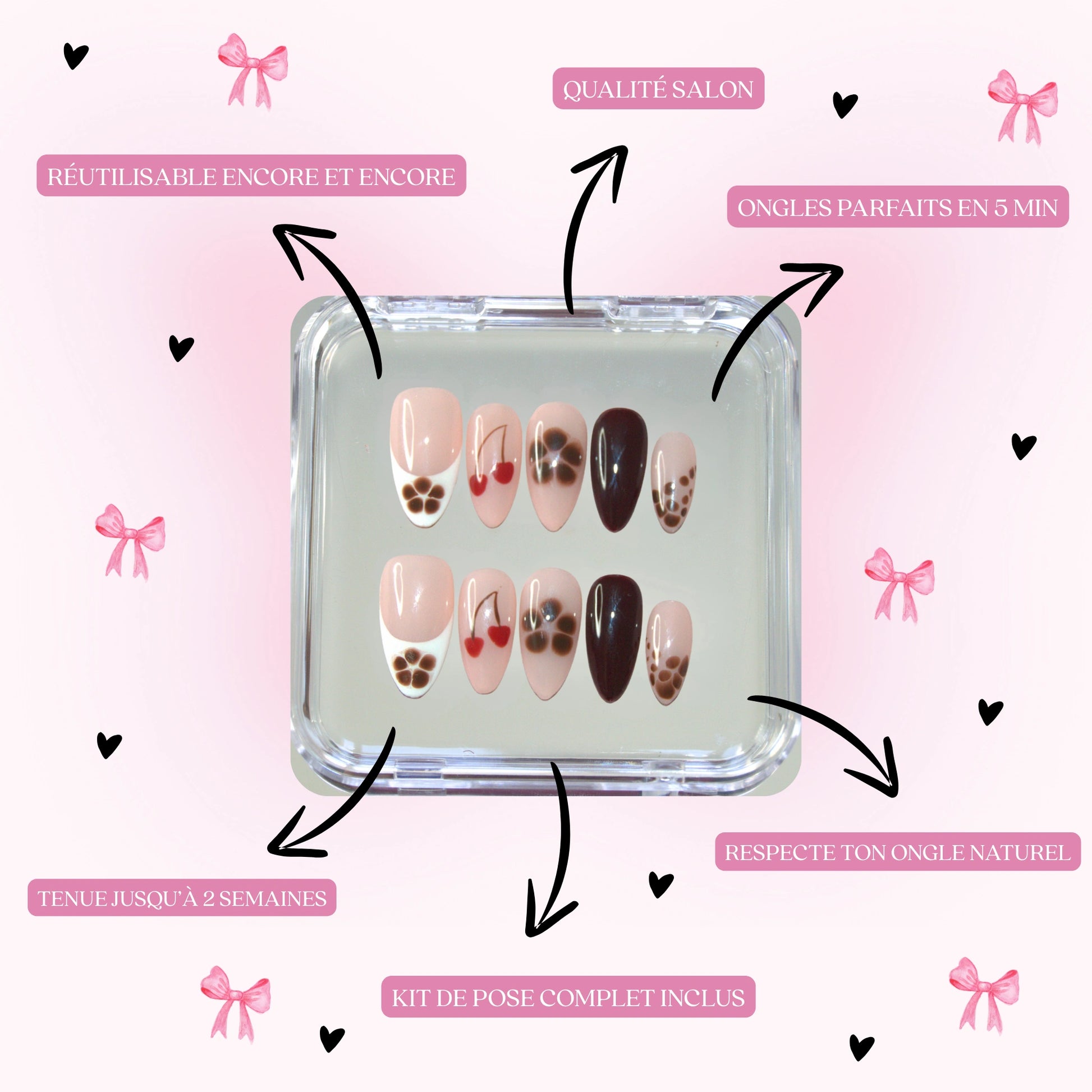 It depends on the method you choose: with gel pads, count 5 to 7 days: perfect for an event or everyday use. With glue, your false nails can last up to 14 days, depending on your daily routine. And the best part? You can take them off whenever you want and reuse them as much as you want, just peel them off carefully 🌸