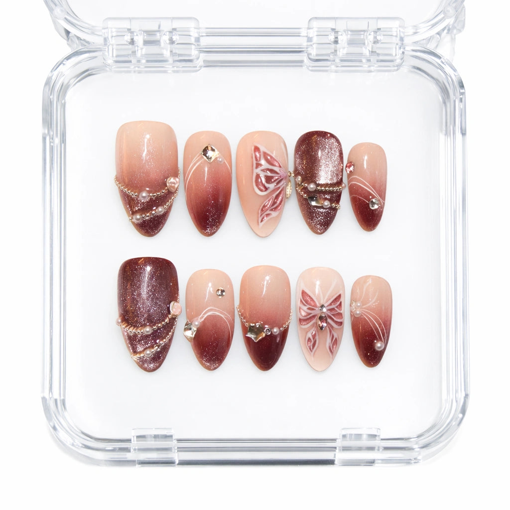 Handmade models, like Mimi's, are stronger, thicker, and offer unique and intricate finishes. Industrial press-ons are often more fragile and less detailed. To recognize them, machine-made press-on nails often have a piece of plastic at the end of the nail that must be filed.