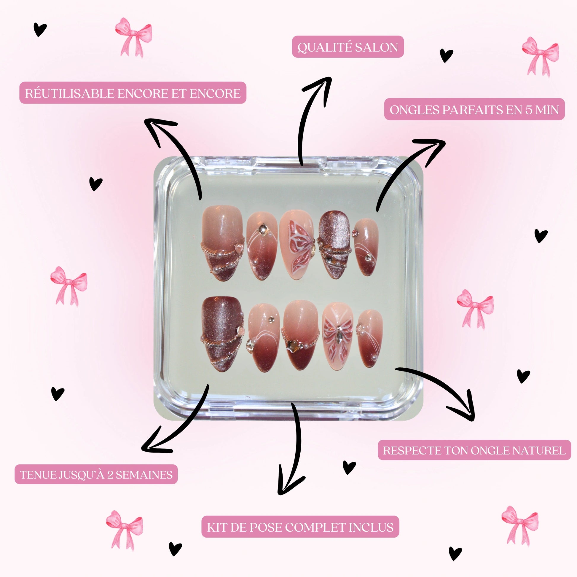 It depends on the method you choose: with gel pads, count 5 to 7 days: perfect for an event or everyday use. With glue, your false nails can last up to 14 days, depending on your daily routine. And the best part? You can take them off whenever you want and reuse them as much as you want, just peel them off carefully 🌸