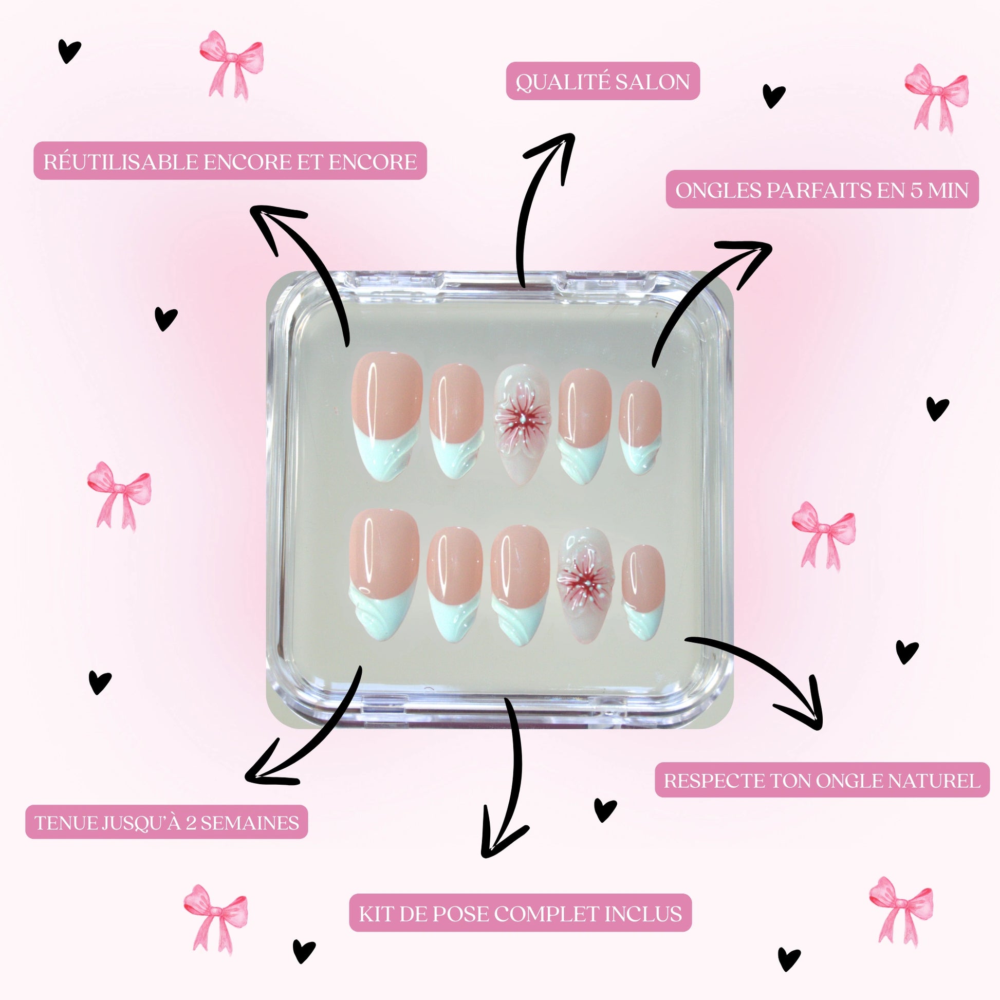 It depends on the method you choose: with gel pads, count 5 to 7 days: perfect for an event or everyday use. With glue, your false nails can last up to 14 days, depending on your daily routine. And the best part? You can take them off whenever you want and reuse them as much as you want, just peel them off carefully 🌸