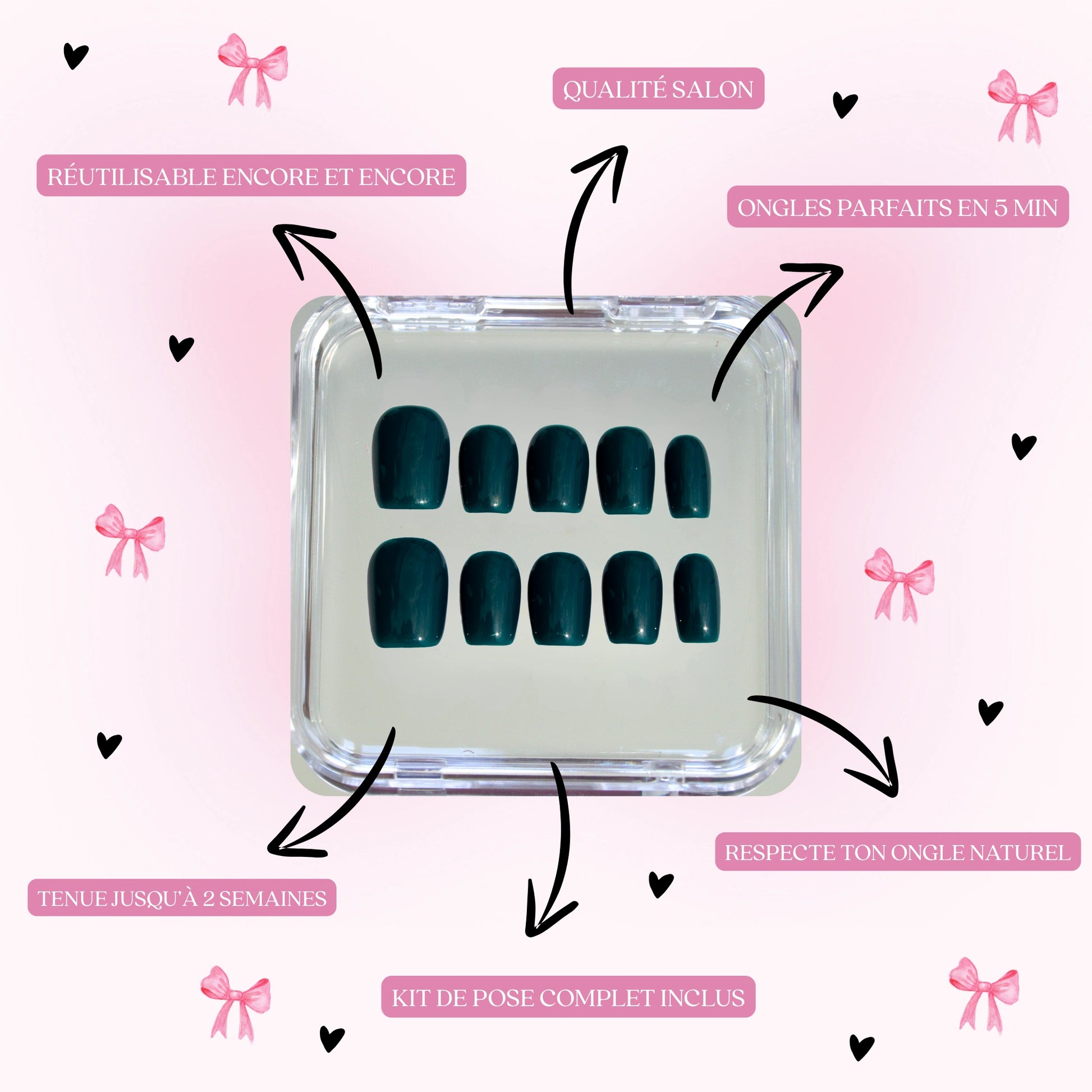 It depends on the method you choose: with gel pads, count 5 to 7 days: perfect for an event or everyday use. With glue, your false nails can last up to 14 days, depending on your daily routine. And the best part? You can take them off whenever you want and reuse them as much as you want, just peel them off carefully 🌸