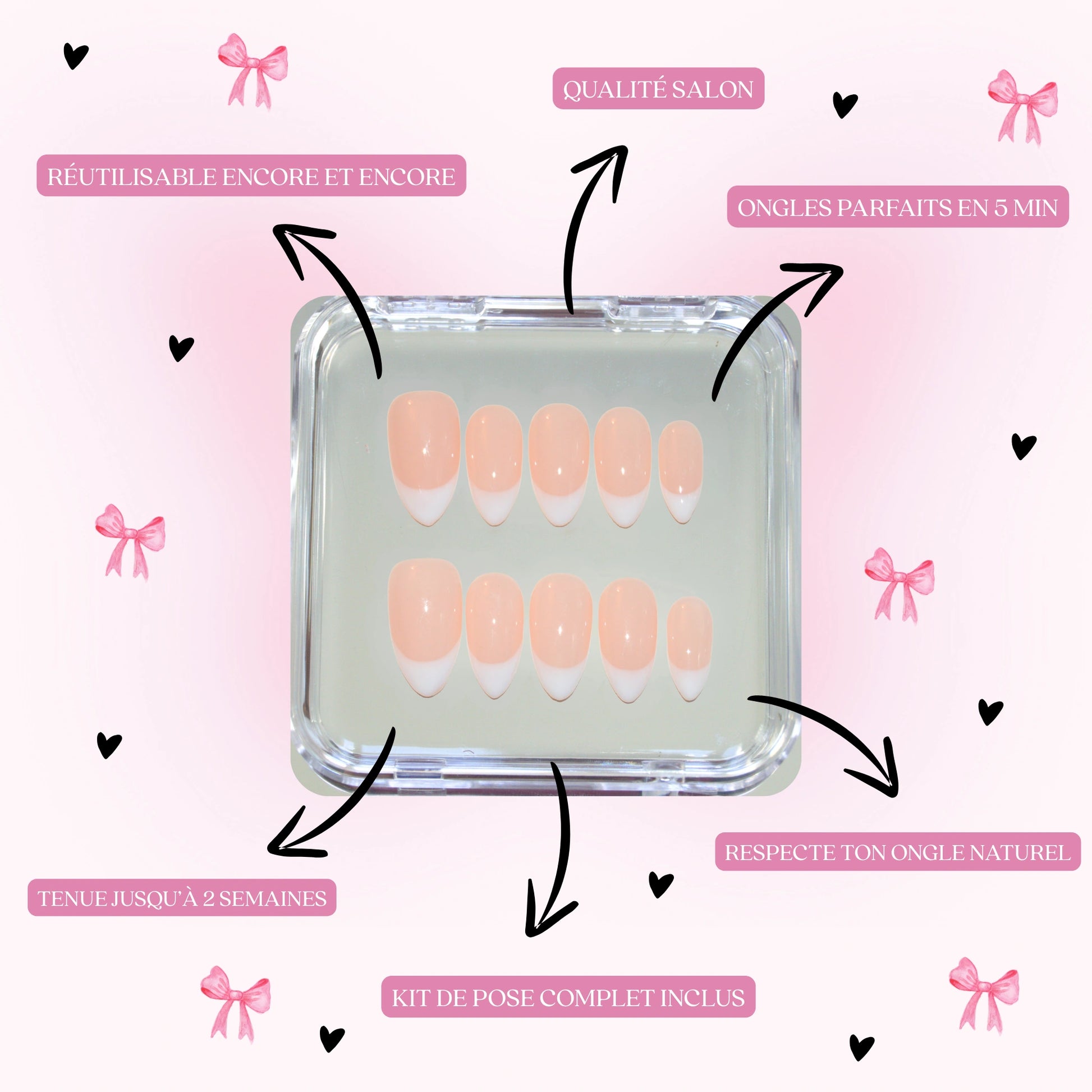 It depends on the method you choose: with gel pads, count 5 to 7 days: perfect for an event or everyday use. With glue, your false nails can last up to 14 days, depending on your daily routine. And the best part? You can take them off whenever you want and reuse them as much as you want, just peel them off carefully 🌸