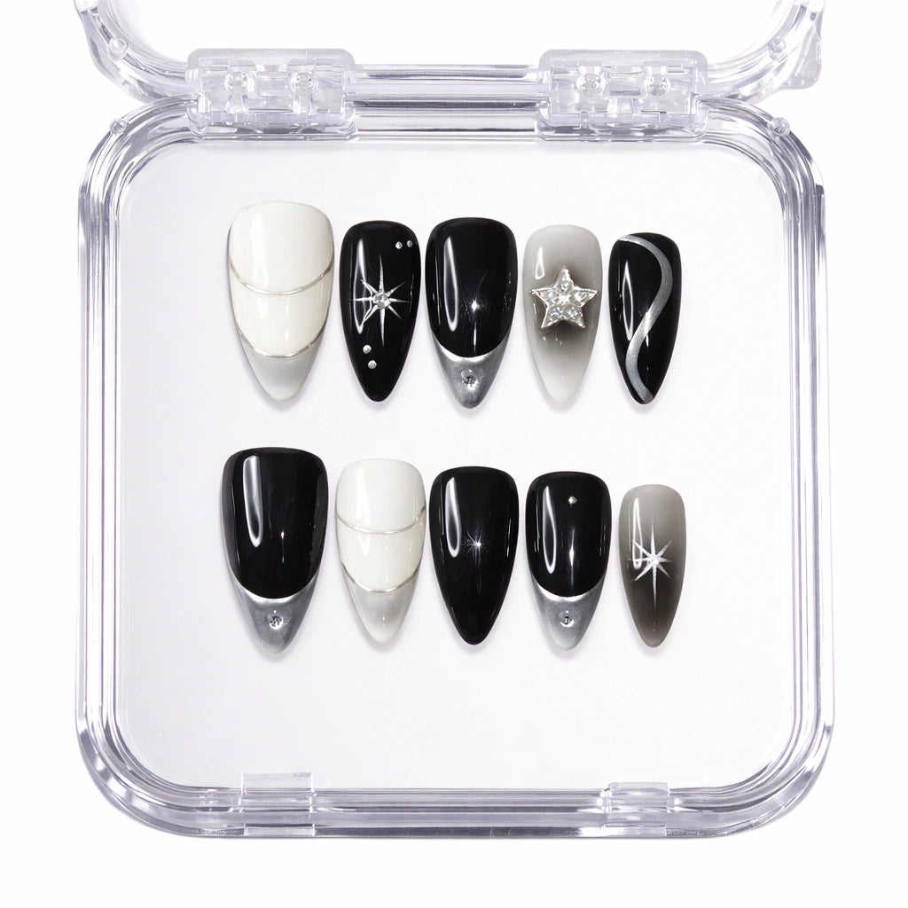 Handmade press-on false nails in gel and acrylic in black, white and silver, embellished with metallic details and 3D stars. Subtle contrast and glossy finish.