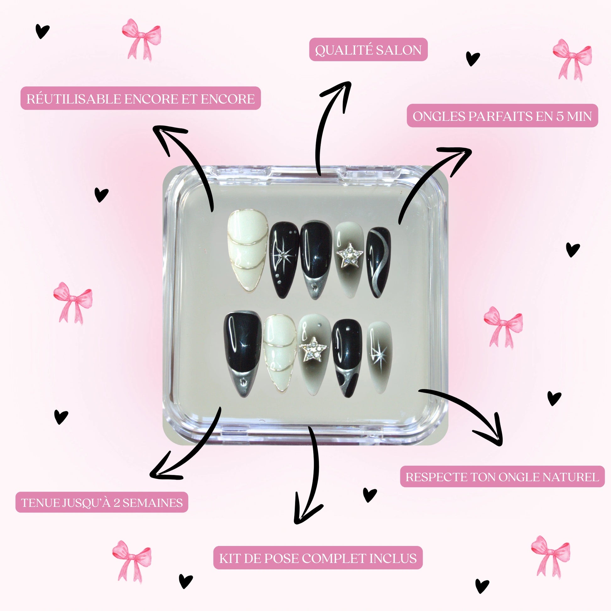 It depends on the method you choose: with gel pads, count 5 to 7 days: perfect for an event or everyday use. With glue, your false nails can last up to 14 days, depending on your daily routine. And the best part? You can take them off whenever you want and reuse them as much as you want, just peel them off carefully 🌸