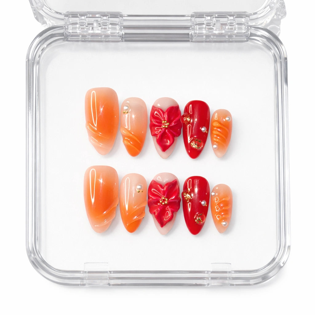Handmade press-on false nails in gel and acrylic in shades of orange and red, decorated with 3D flowers, pearls and gold glitter.