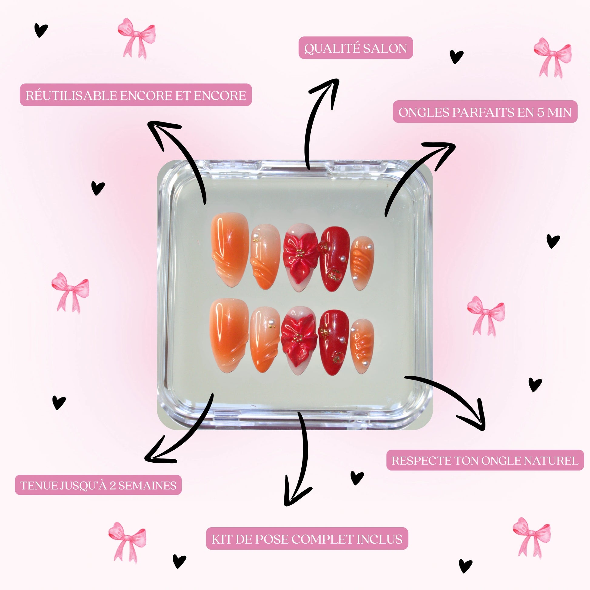 It depends on the method you choose: with gel pads, count 5 to 7 days: perfect for an event or everyday use. With glue, your false nails can last up to 14 days, depending on your daily routine. And the best part? You can take them off whenever you want and reuse them as much as you want, just peel them off carefully 🌸