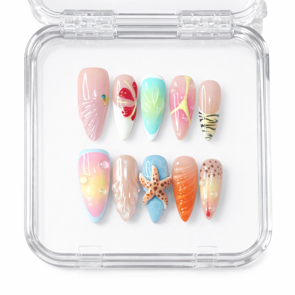 Handmade press-on false nails made of gel and acrylic, combining animal motifs, colorful gradients and 3D decorations such as starfish and seashells.