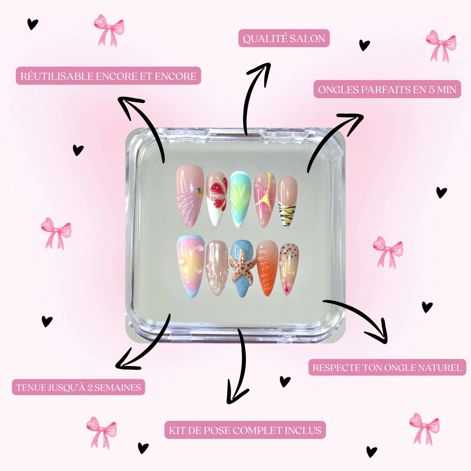 It depends on the method you choose: with gel pads, count 5 to 7 days: perfect for an event or everyday use. With glue, your false nails can last up to 14 days, depending on your daily routine. And the best part? You can take them off whenever you want and reuse them as much as you want, just peel them off carefully 🌸