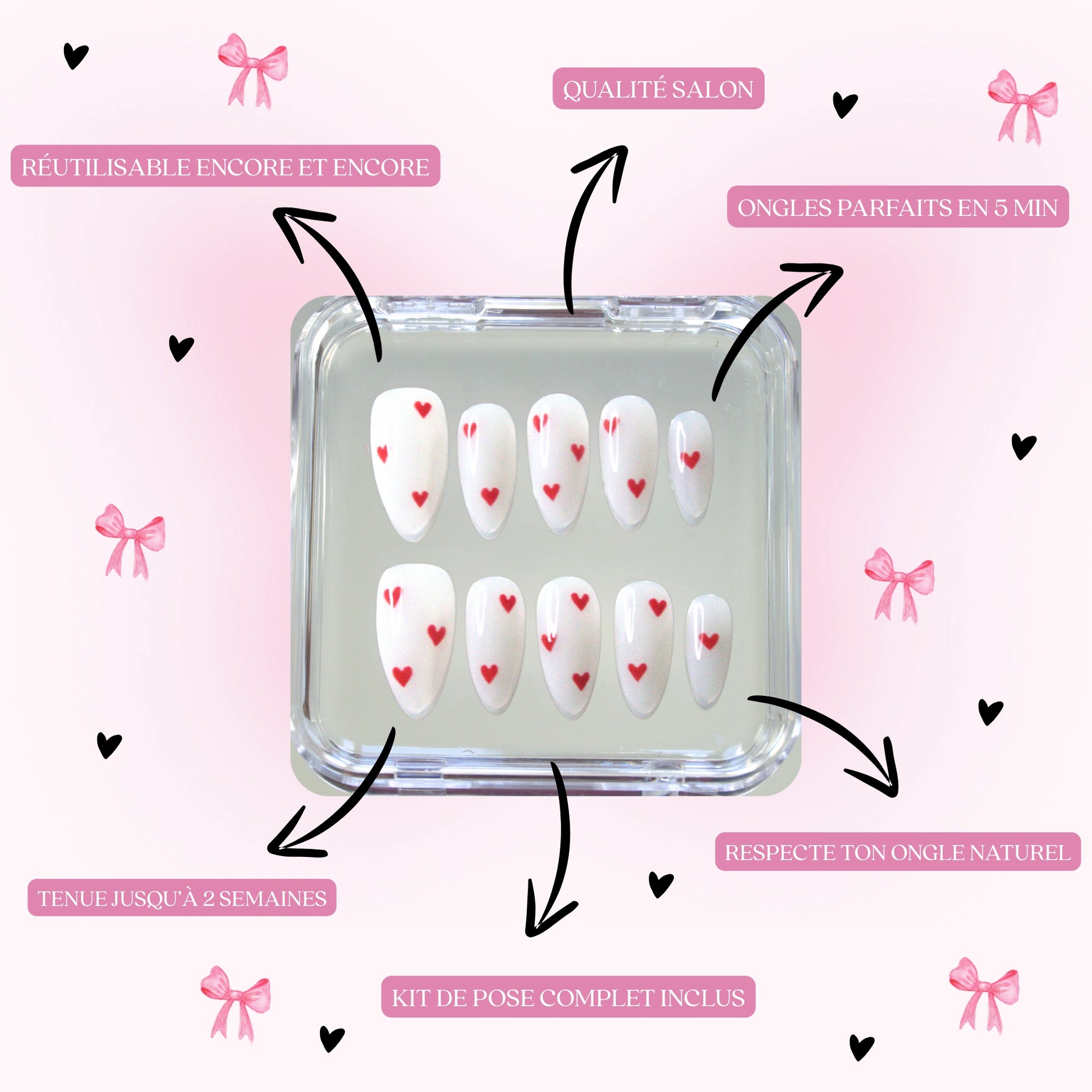It depends on the method you choose: with gel pads, count 5 to 7 days: perfect for an event or everyday use. With glue, your false nails can last up to 14 days, depending on your daily routine. And the best part? You can take them off whenever you want and reuse them as much as you want, just peel them off carefully 🌸