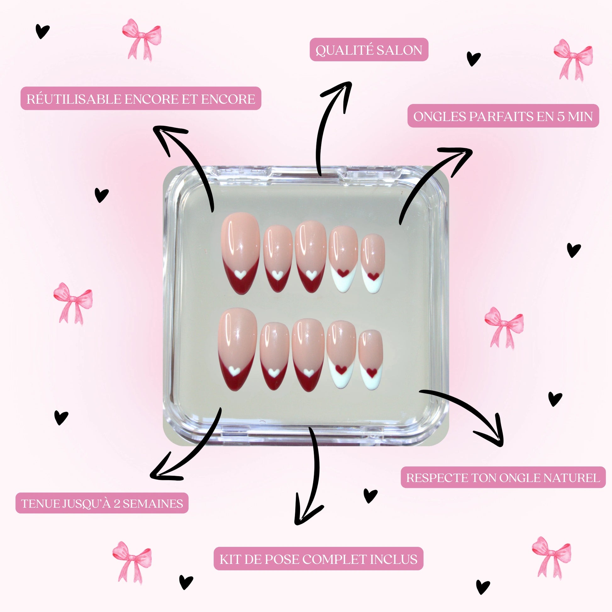 It depends on the method you choose: with gel pads, count 5 to 7 days: perfect for an event or everyday use. With glue, your false nails can last up to 14 days, depending on your daily routine. And the best part? You can take them off whenever you want and reuse them as much as you want, just peel them off carefully 🌸