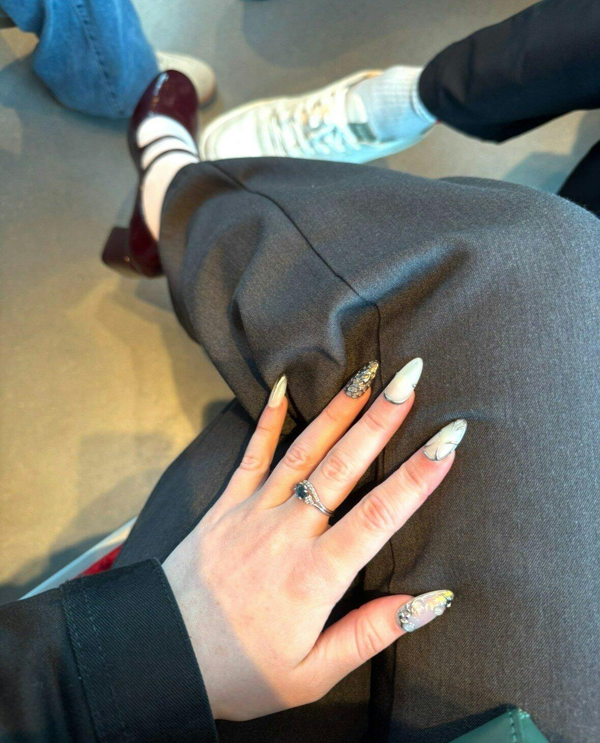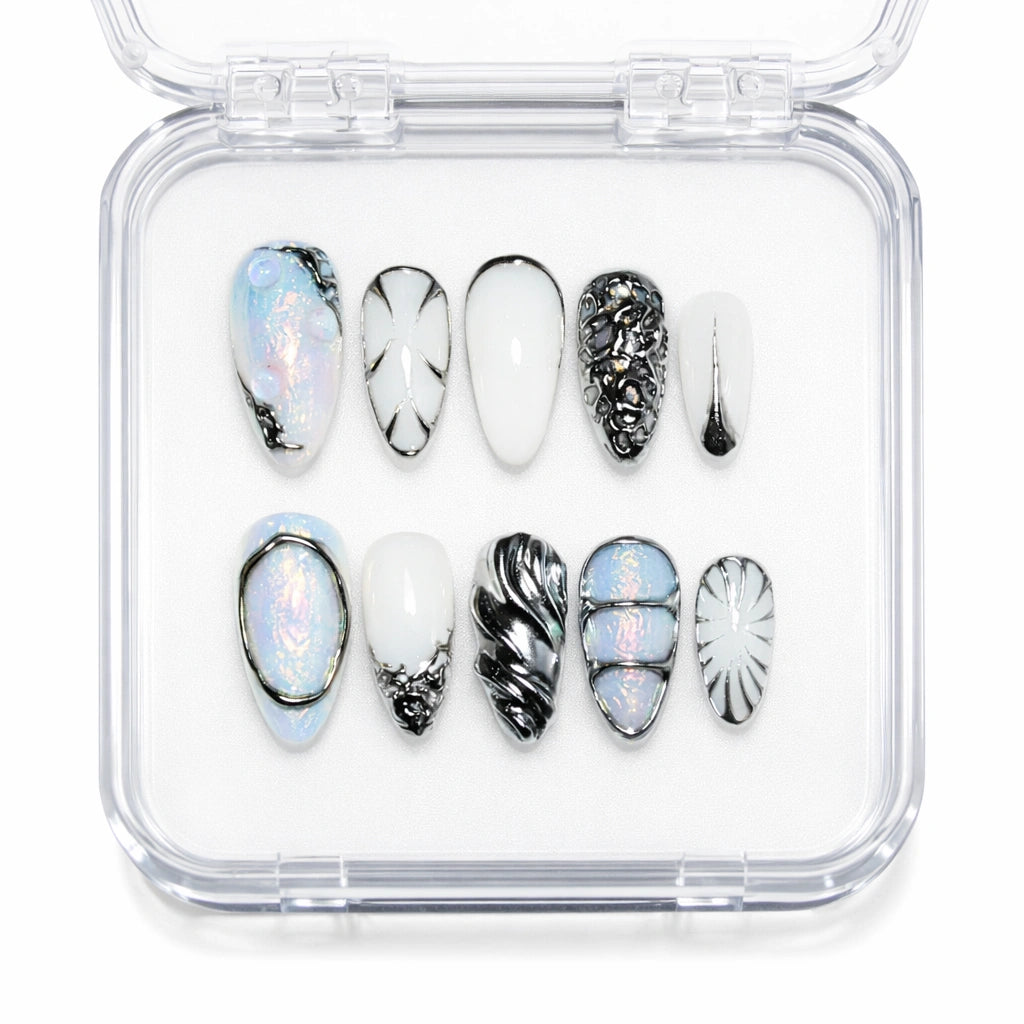 Press-on false nails in gel and acrylic, chrome silver and opal effects with 3D touches.