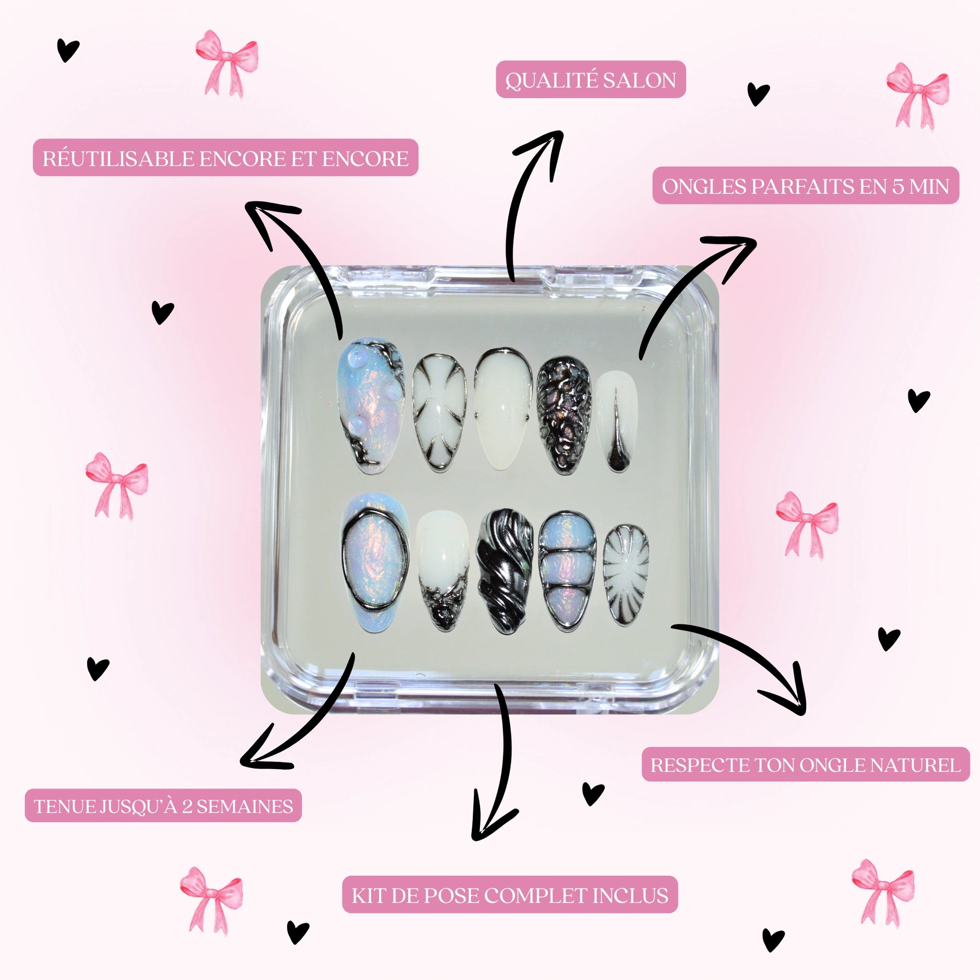 It depends on the method you choose: with gel pads, count 5 to 7 days: perfect for an event or everyday use. With glue, your false nails can last up to 14 days, depending on your daily routine. And the best part? You can take them off whenever you want and reuse them as much as you want, just peel them off carefully 🌸