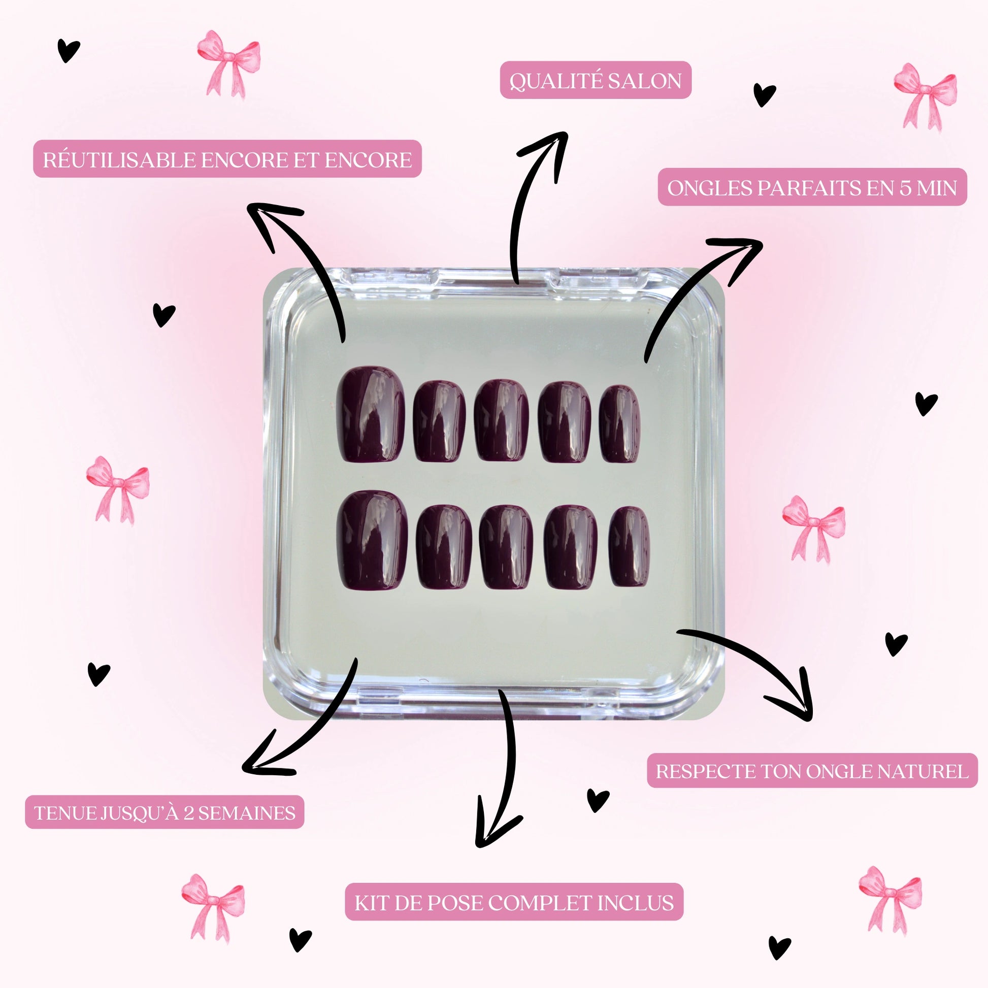 Handmade press-on false nails in gel and acrylic, deep burgundy, with a glossy finish. A refined and bold look, ideal for an elegant and assertive manicure.