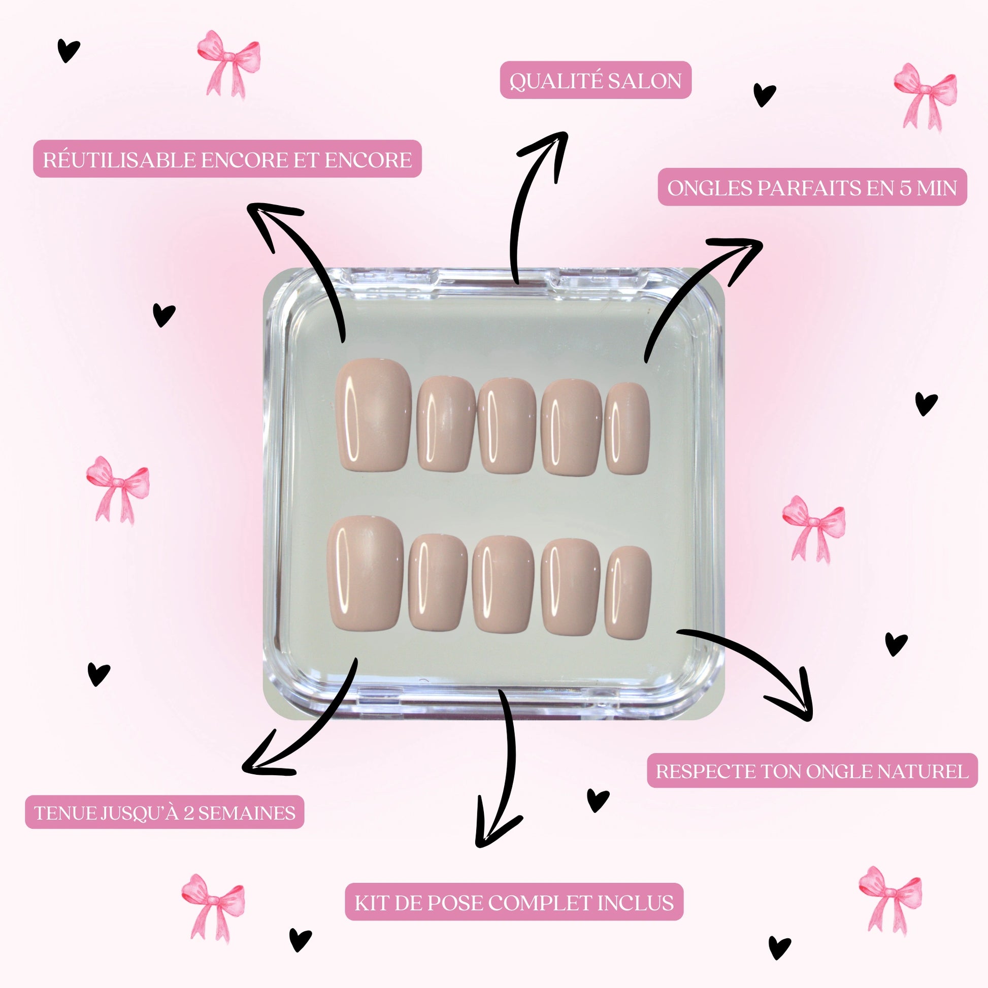 It depends on the method you choose: with gel pads, count 5 to 7 days: perfect for an event or everyday use. With glue, your false nails can last up to 14 days, depending on your daily routine. And the best part? You can take them off whenever you want and reuse them as much as you want, just peel them off carefully 🌸