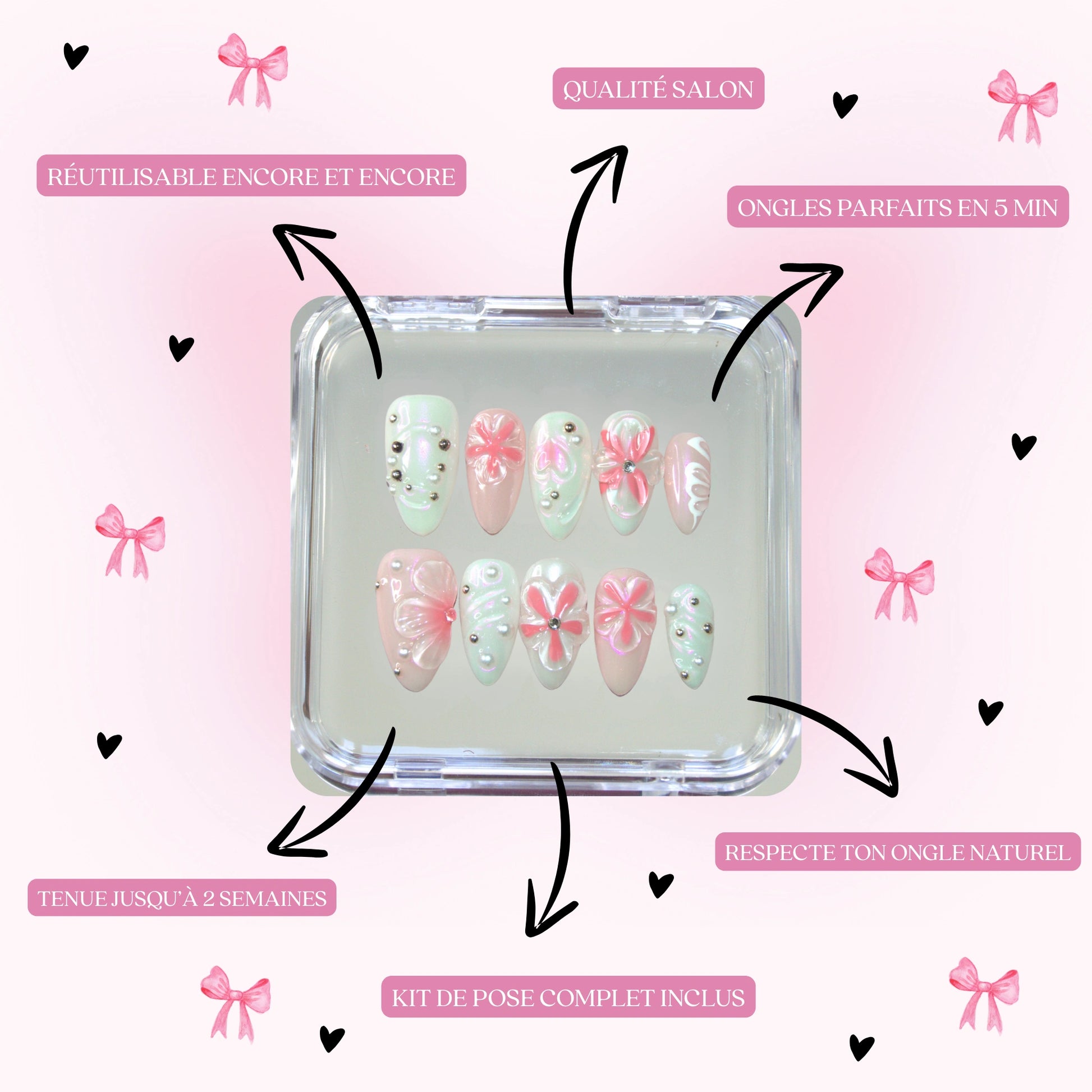 It depends on the method you choose: with gel pads, count 5 to 7 days: perfect for an event or everyday use. With glue, your false nails can last up to 14 days, depending on your daily routine. And the best part? You can take them off whenever you want and reuse them as much as you want, just peel them off carefully 🌸