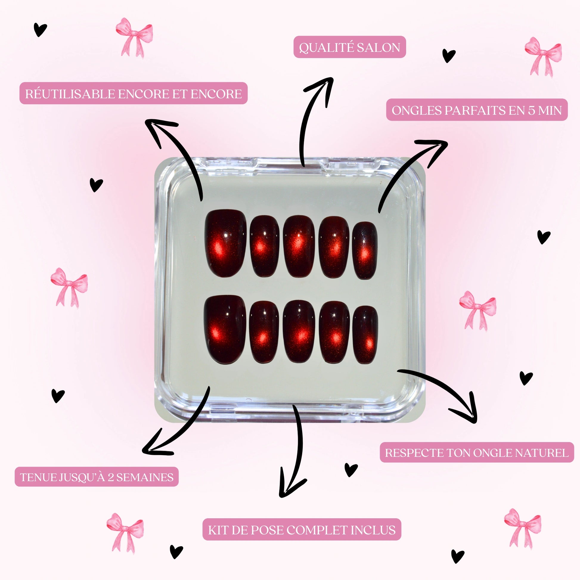 It depends on the method you choose: with gel pads, count 5 to 7 days: perfect for an event or everyday use. With glue, your false nails can last up to 14 days, depending on your daily routine. And the best part? You can take them off whenever you want and reuse them as much as you want, just peel them off carefully 🌸