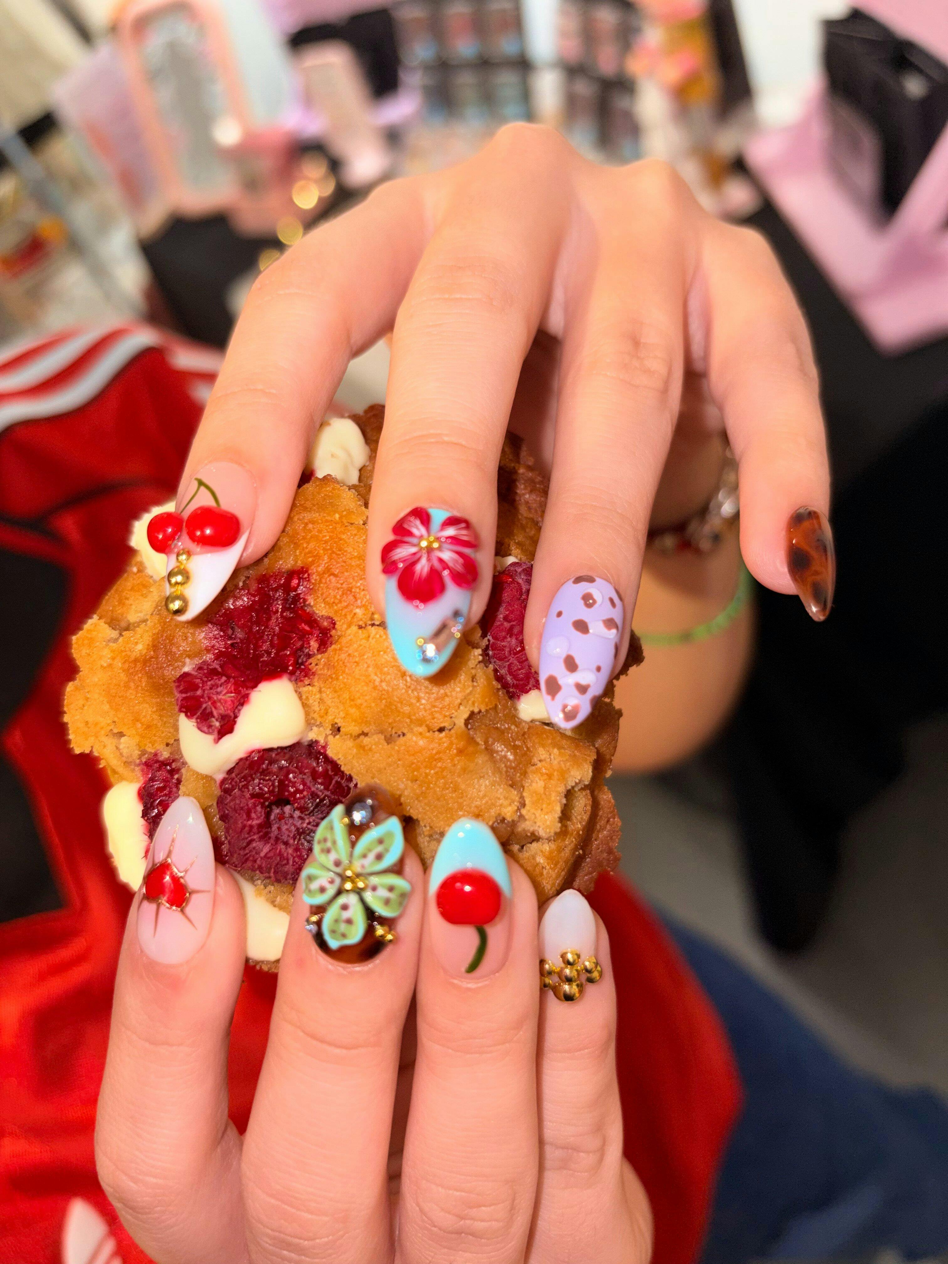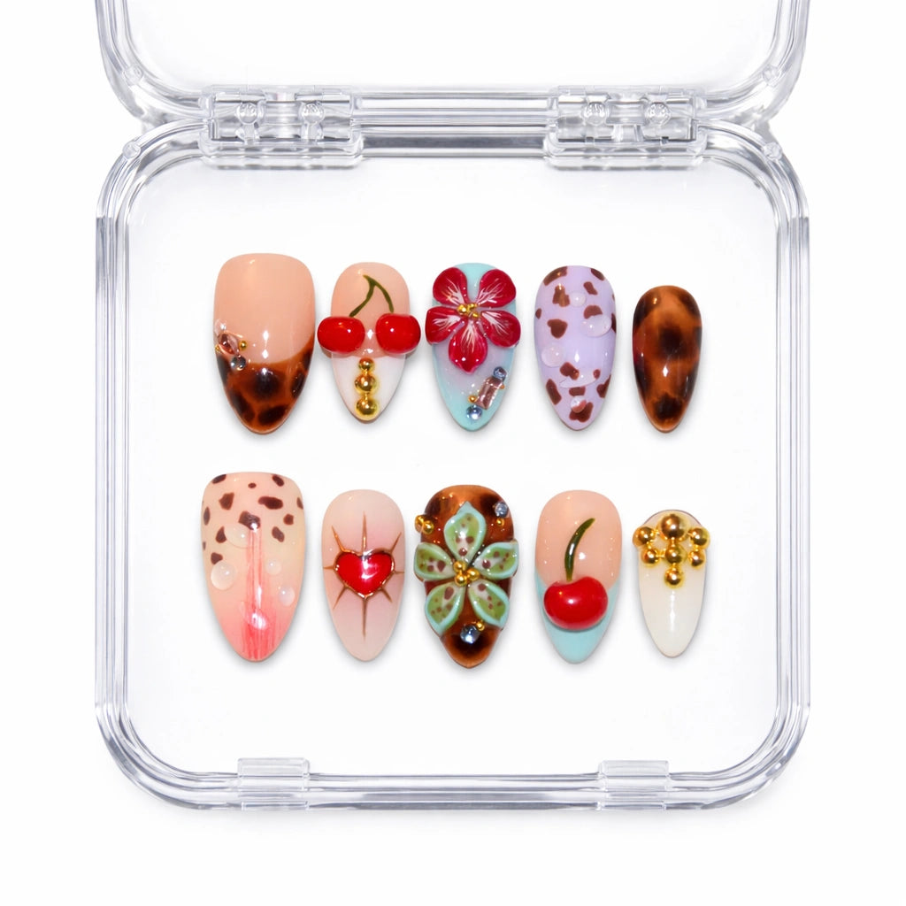 Press-on nails handmade from gel and acrylic, with colorful designs and 3D details. A bold and creative style, perfect for an original and characterful manicure.