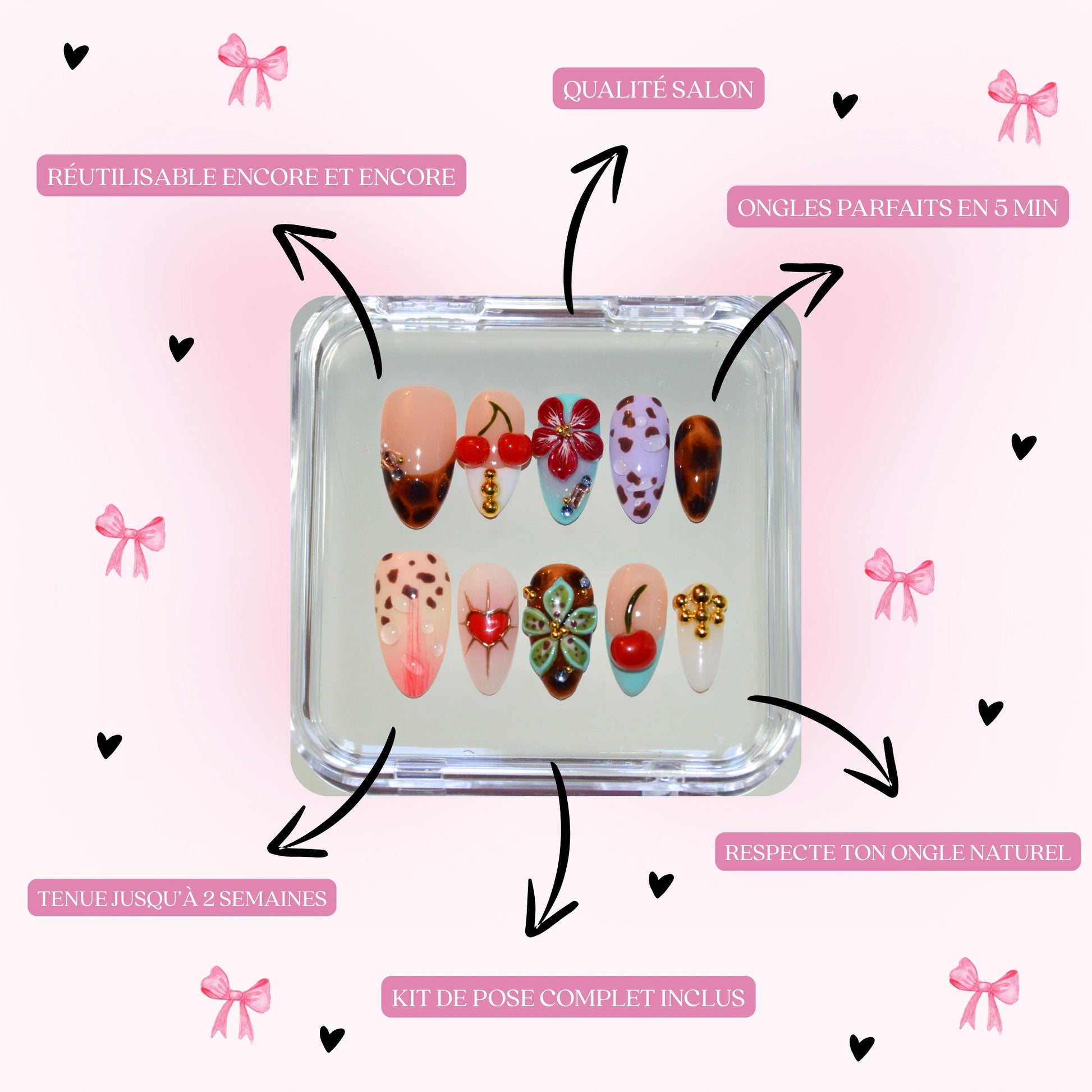 It depends on the method you choose: with gel pads, count 5 to 7 days: perfect for an event or everyday use. With glue, your false nails can last up to 14 days, depending on your daily routine. And the best part? You can take them off whenever you want and reuse them as much as you want, just peel them off carefully 🌸