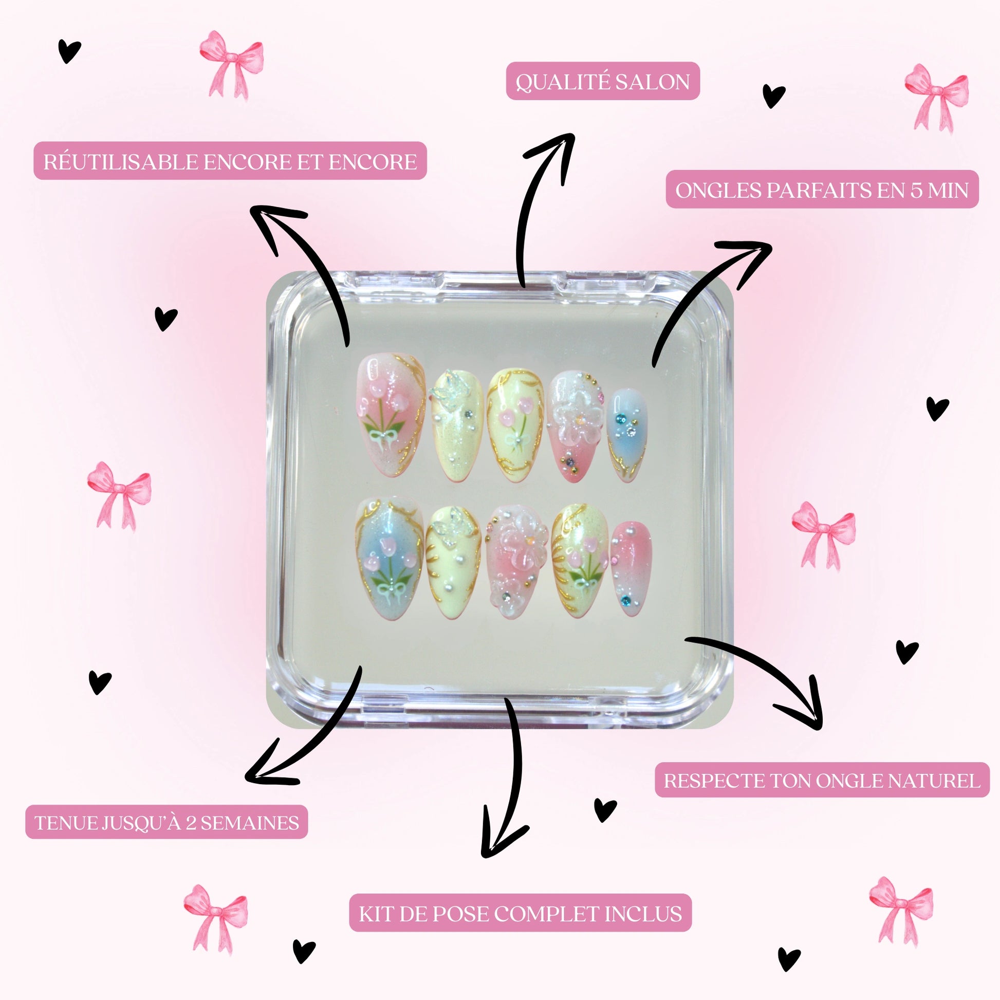 It depends on the method you choose: with gel pads, count 5 to 7 days: perfect for an event or everyday use. With glue, your false nails can last up to 14 days, depending on your daily routine. And the best part? You can take them off whenever you want and reuse them as much as you want, just peel them off carefully 🌸