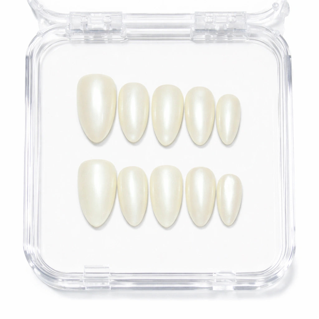 Press-on nails handmade in gel and acrylic, pearly white finish.