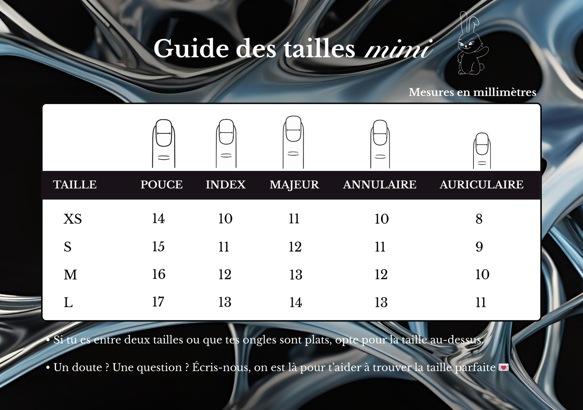 Veuillez noter que les tableaux des tailles se rapportent aux ongles de la marque MiMi et sont conçus pour s'adapter aux mesures suivantes des doigts.