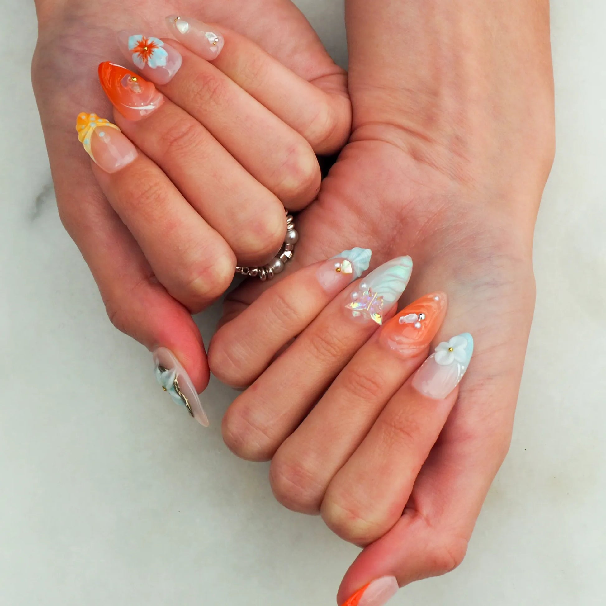Faux ongles press-on faits main aux nuances bleu, orange et nude, sublimés de détails floraux et de décorations en relief. Un design qui évoque l’océan et les vacances en bord de mer, pour une manucure éclatante et estivale.