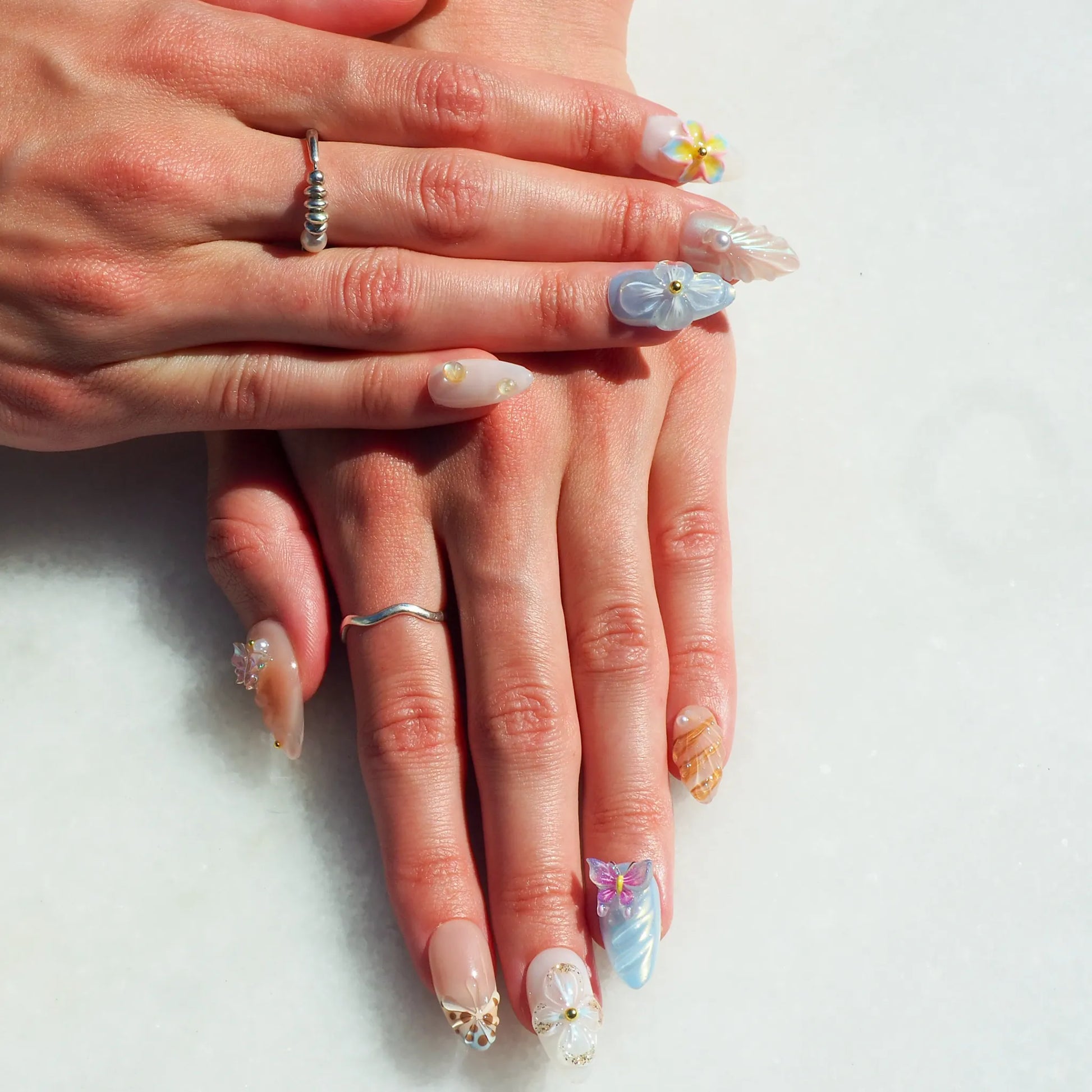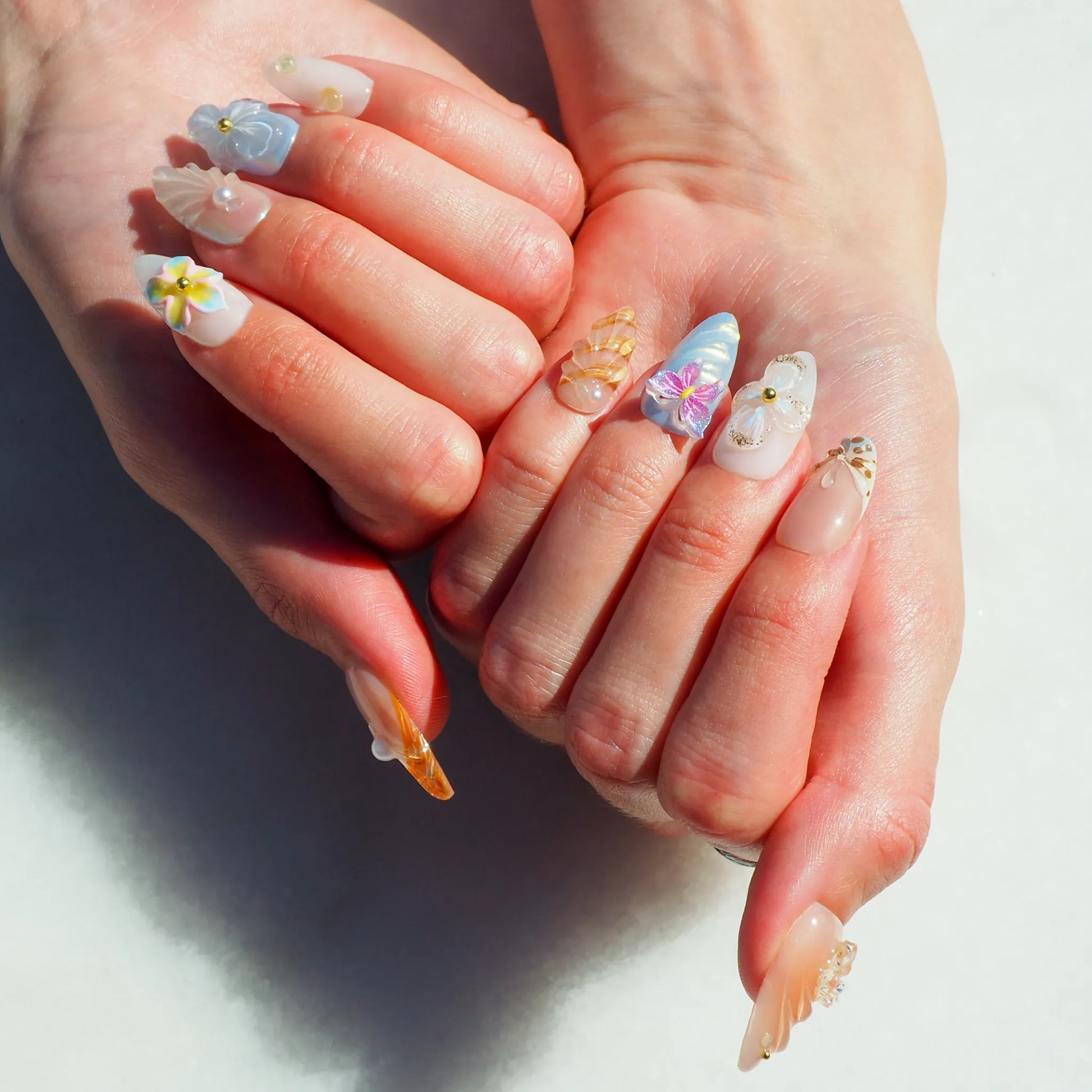 Faux ongles press-on faits main en rose, nude et bleu, ornés de coquillages, fleurs et papillons 3D. Un design inspiré de l’été et de la plage, qui apporte une touche lumineuse et originale à la manucure.
