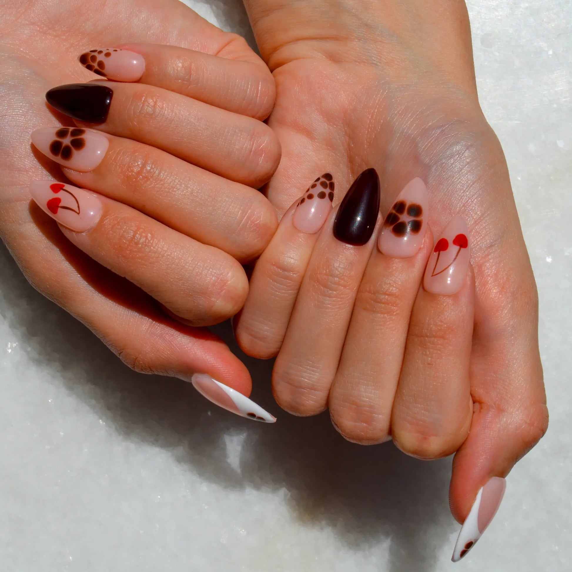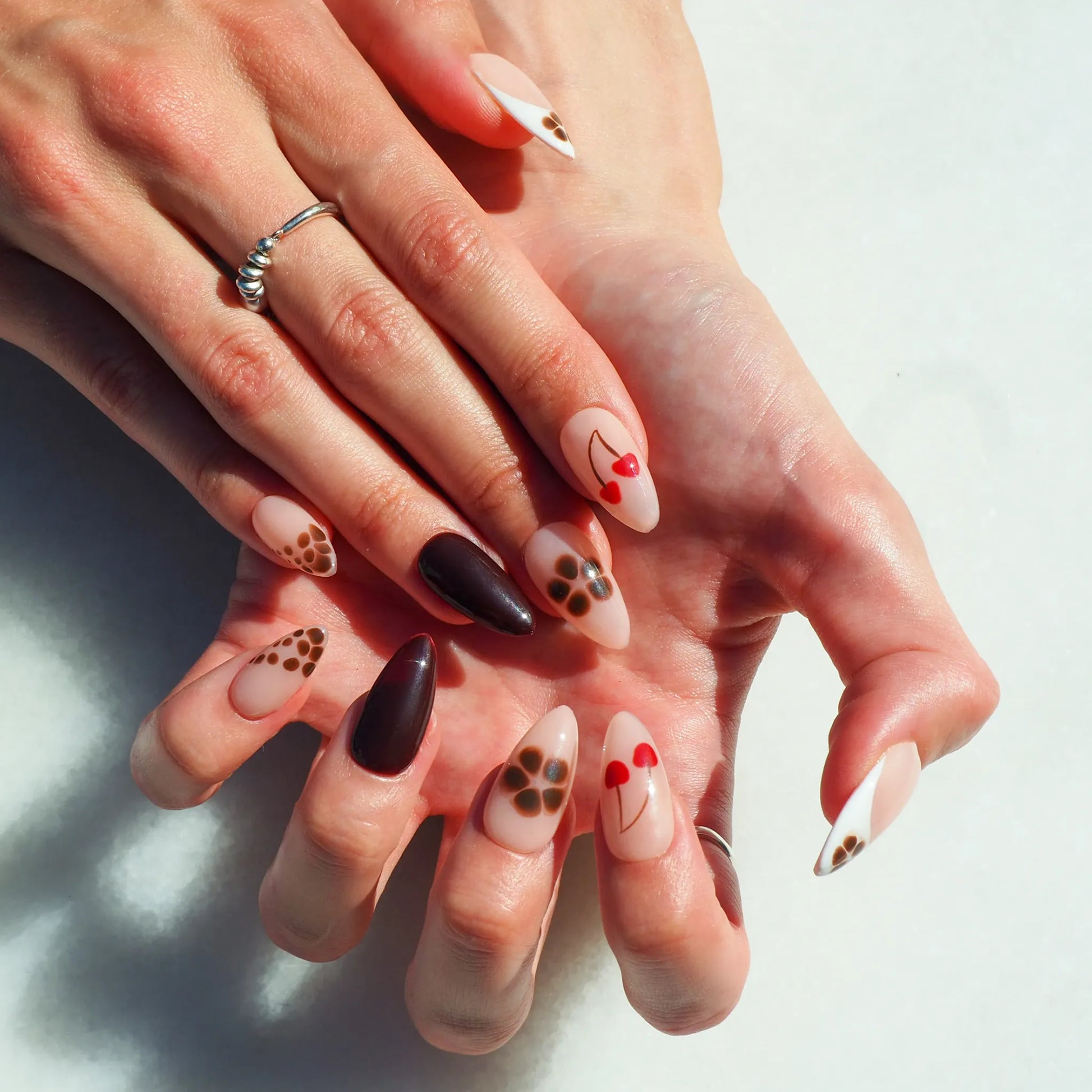 Faux ongles press-on faits main en nude et marron, décorés de motifs floraux et de cerises rouges. Un design original et contrasté qui allie douceur et audace pour une manucure unique.