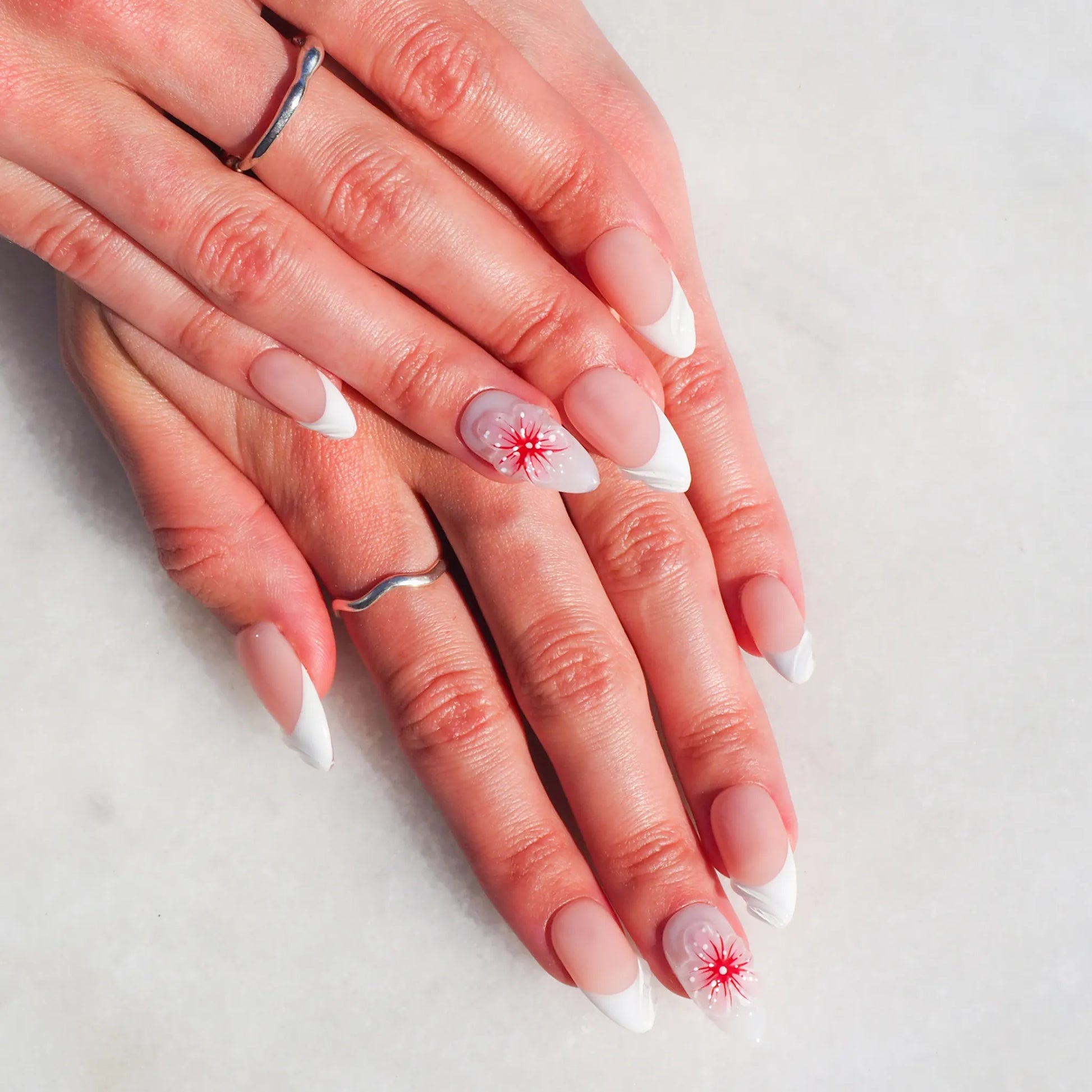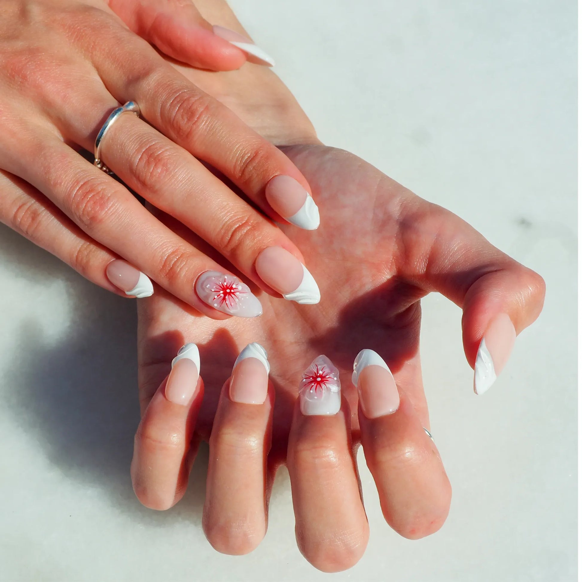 Faux ongles press-on faits main en nude et blanc, décorés de fleurs 3D aux détails rouges. Un design délicat et élégant qui met en valeur la manucure avec simplicité et raffinement.