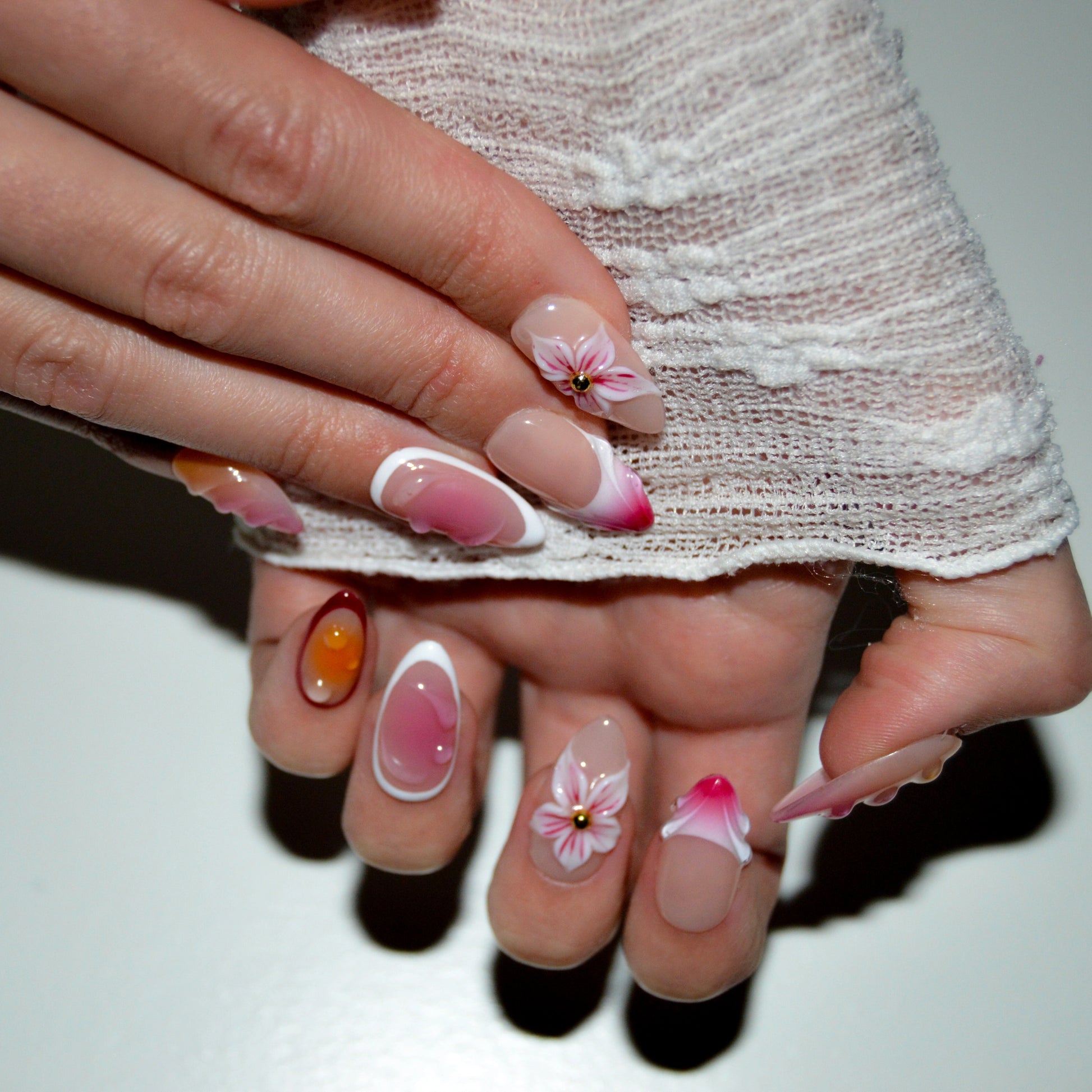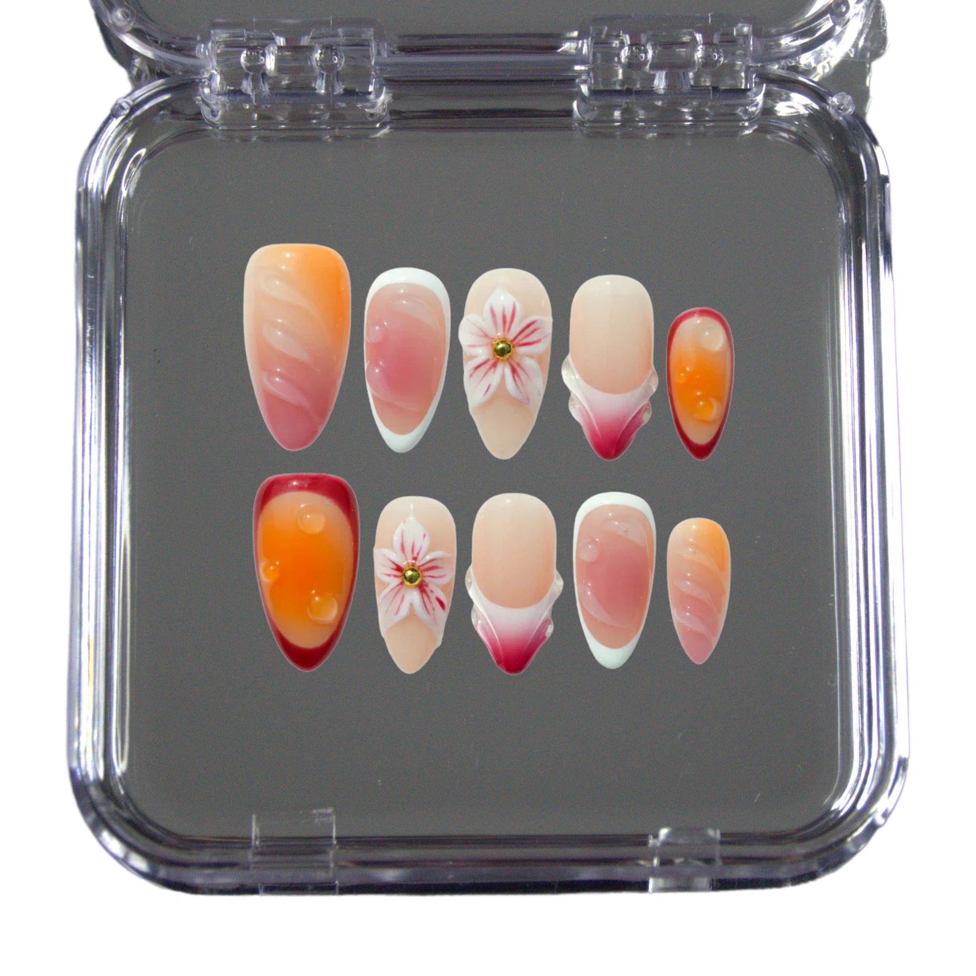 Faux ongles press-on faits main aux nuances rose et orange, décorés de fleurs 3D blanches et de dégradés lumineux. Un design délicat et coloré qui apporte une touche élégante et pétillante à la manucure.