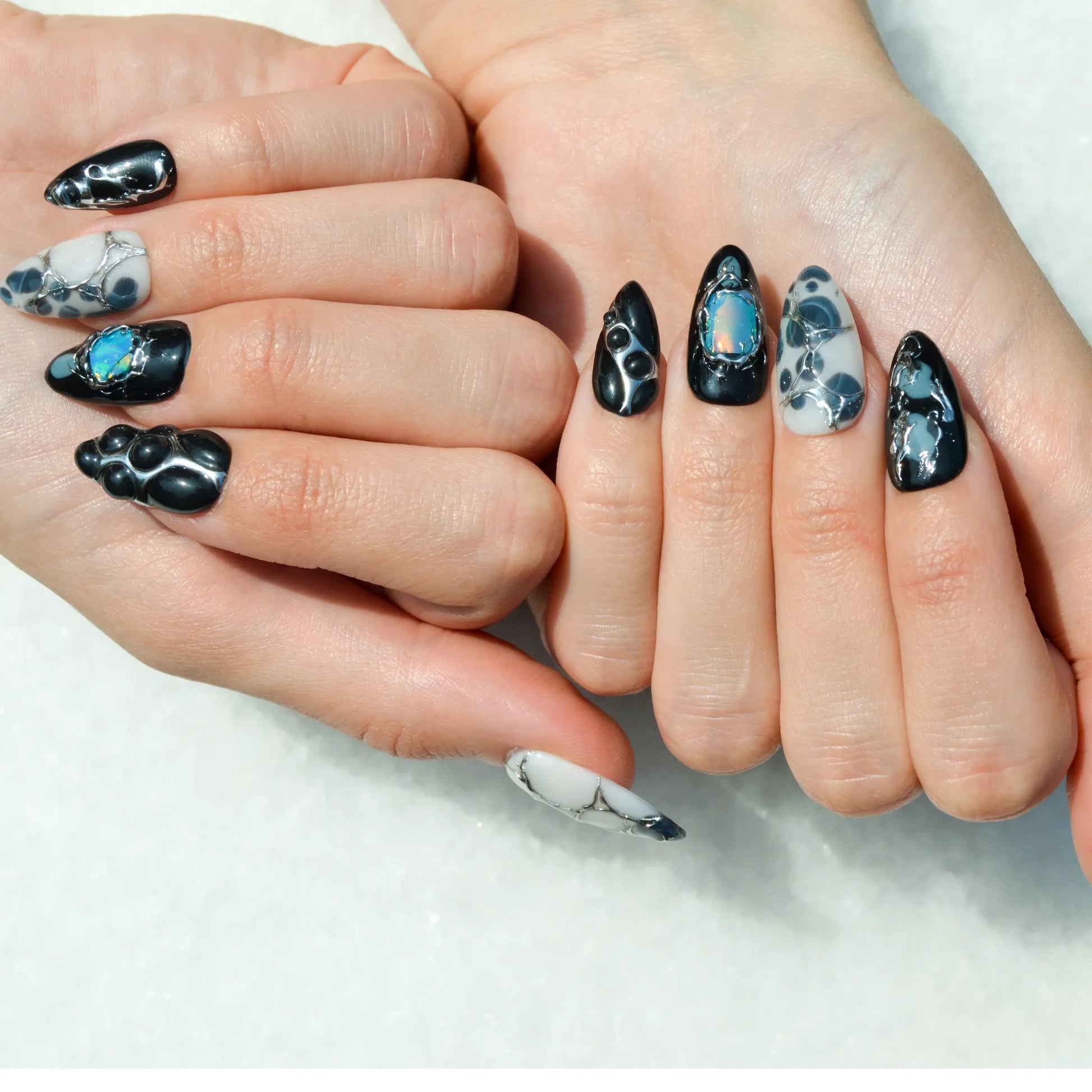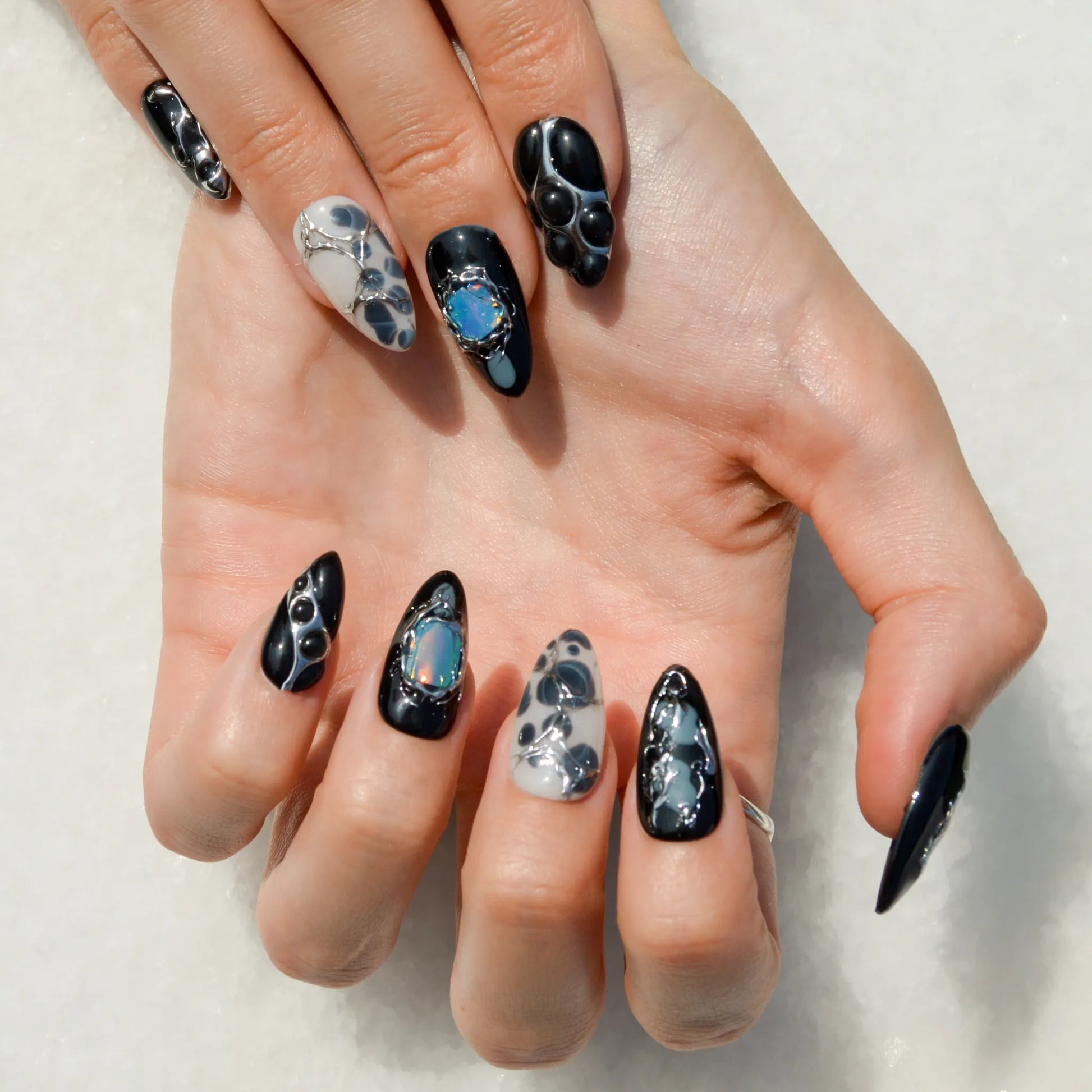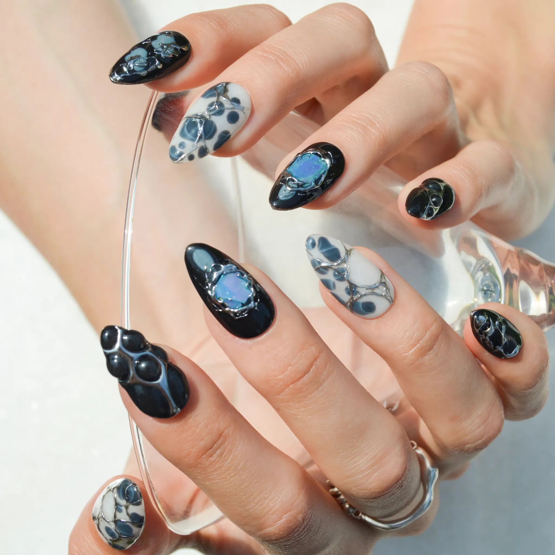 Faux ongles press-on faits main en noir et blanc nacré, décorés d’effets métallisés et de pierres 3D irisées. Un design tendance et audacieux qui donne à la manucure un style unique et sophistiqué.