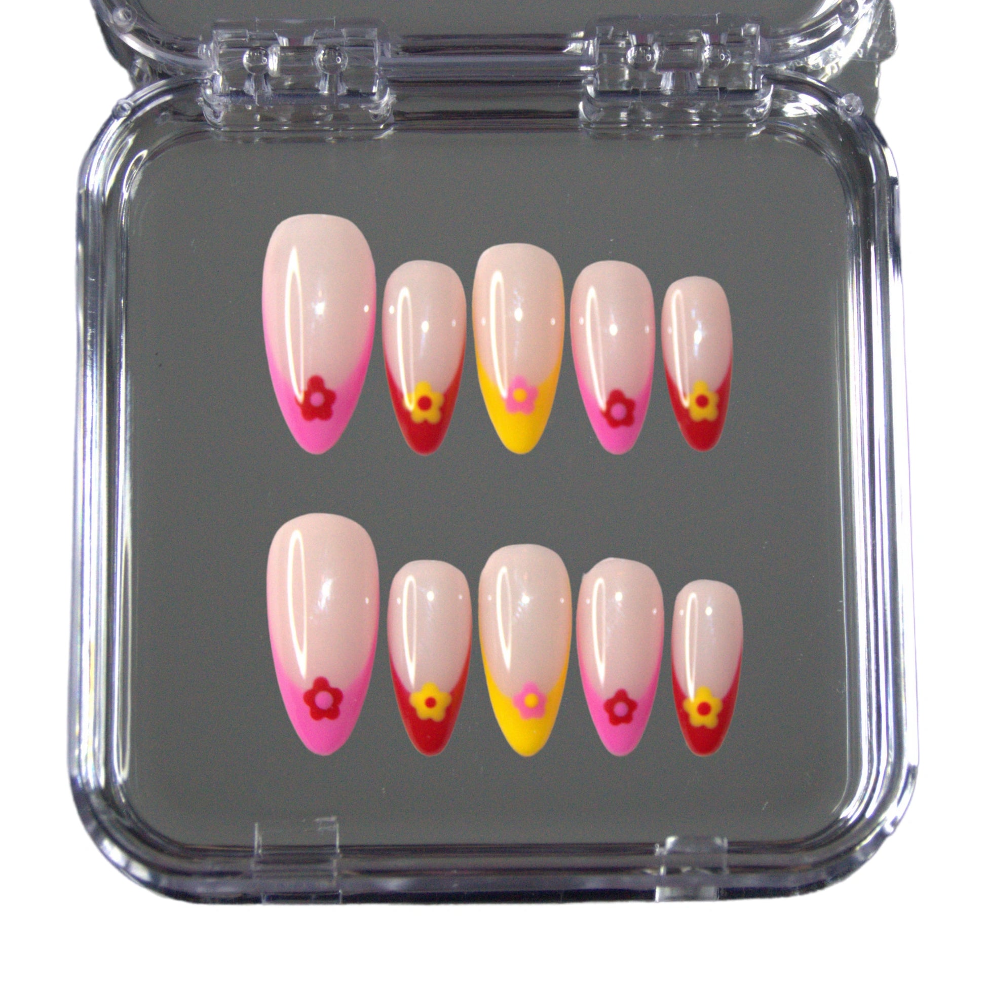 Faux ongles press-on faits main avec une base nude et un french coloré rose, rouge ou jaune, décorés de petites fleurs vives. Un design ludique et original qui apporte une touche joyeuse à la manucure.