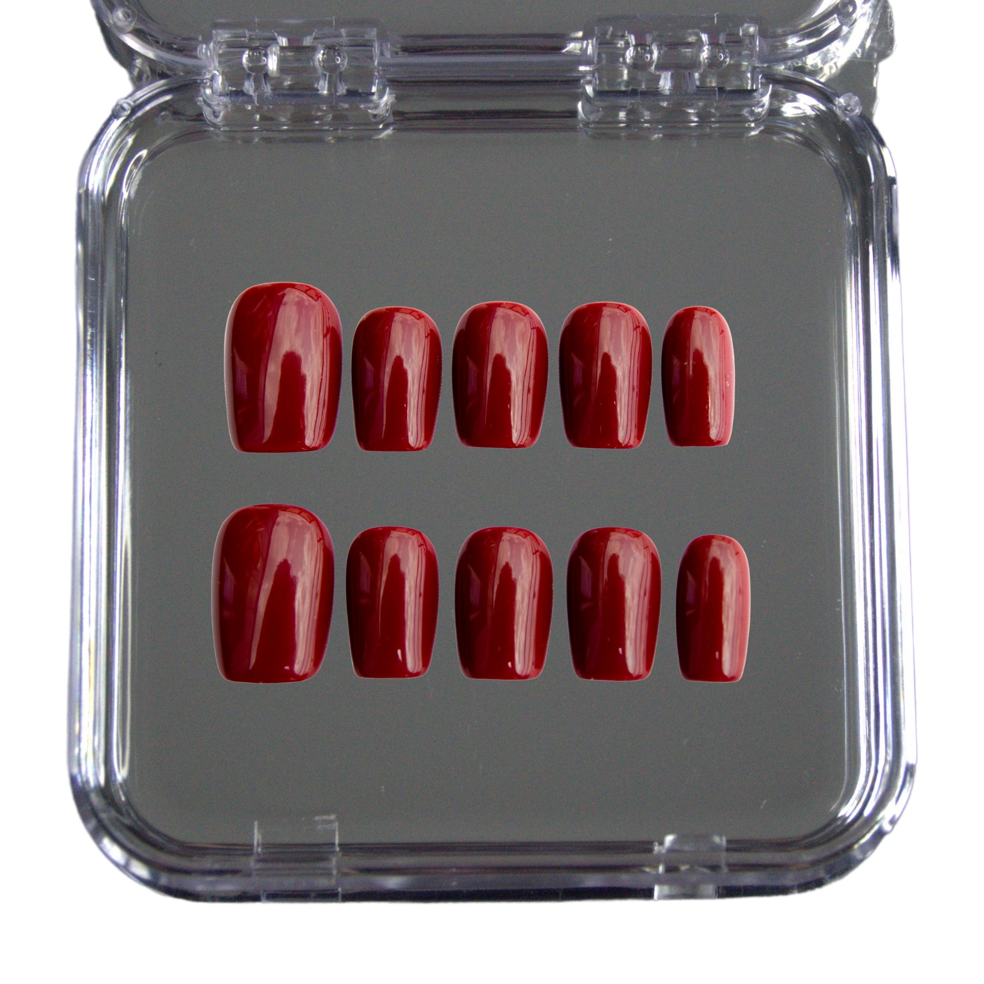 Faux ongles press-on faits main en rouge profond. Une teinte riche et sophistiquée qui capte la lumière et sublime chaque geste. L’élégance discrète mais affirmée pour celles qui aiment un rouge foncé intemporel.