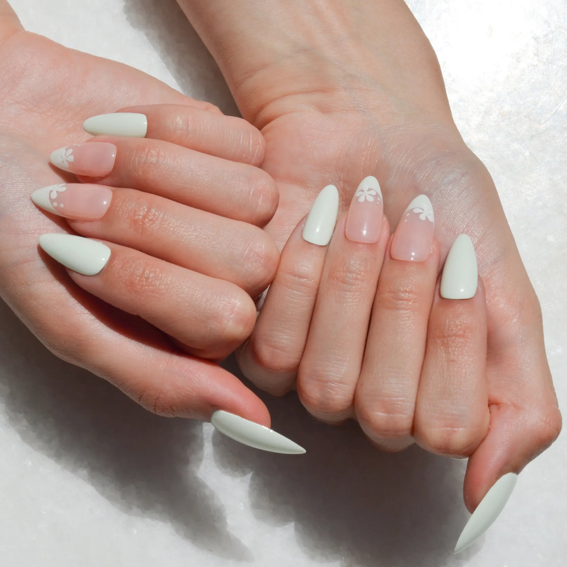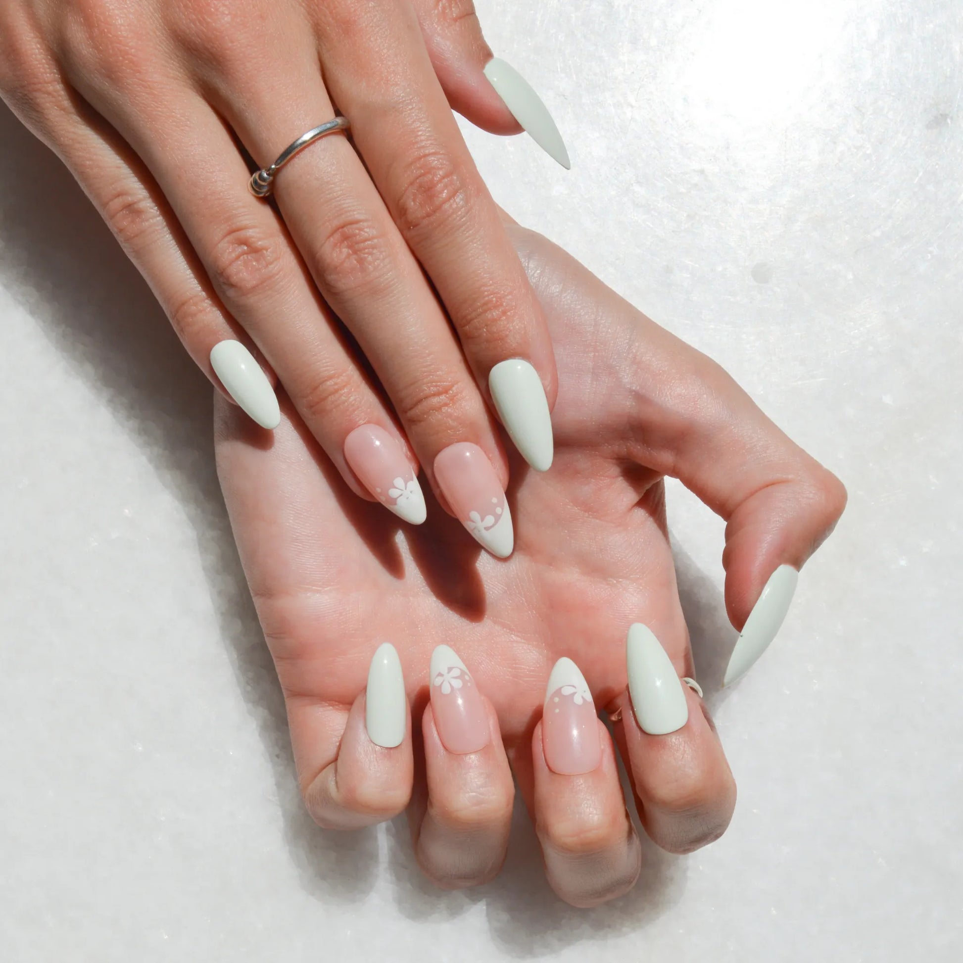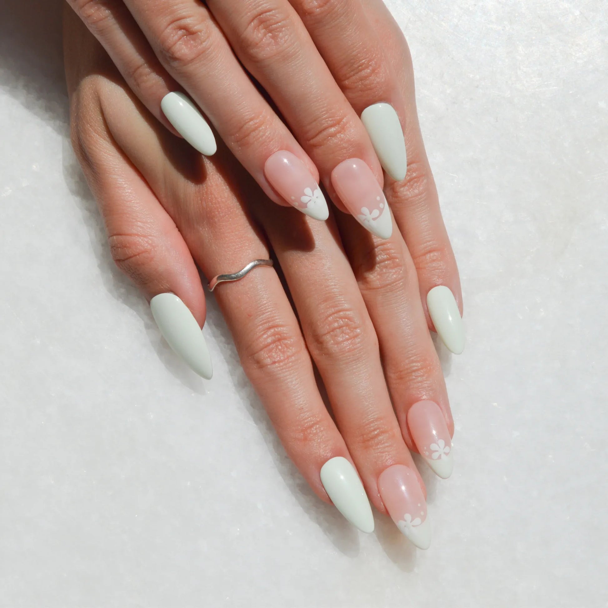Faux ongles Press-on faits main en vert pastel et rose nude, décorés de fleurs blanches délicates. Leur design épuré et élégant apporte une touche naturelle et féminine à ta manucure, idéale pour un rendu soigné au quotidien ou lors d’occasions spéciales.