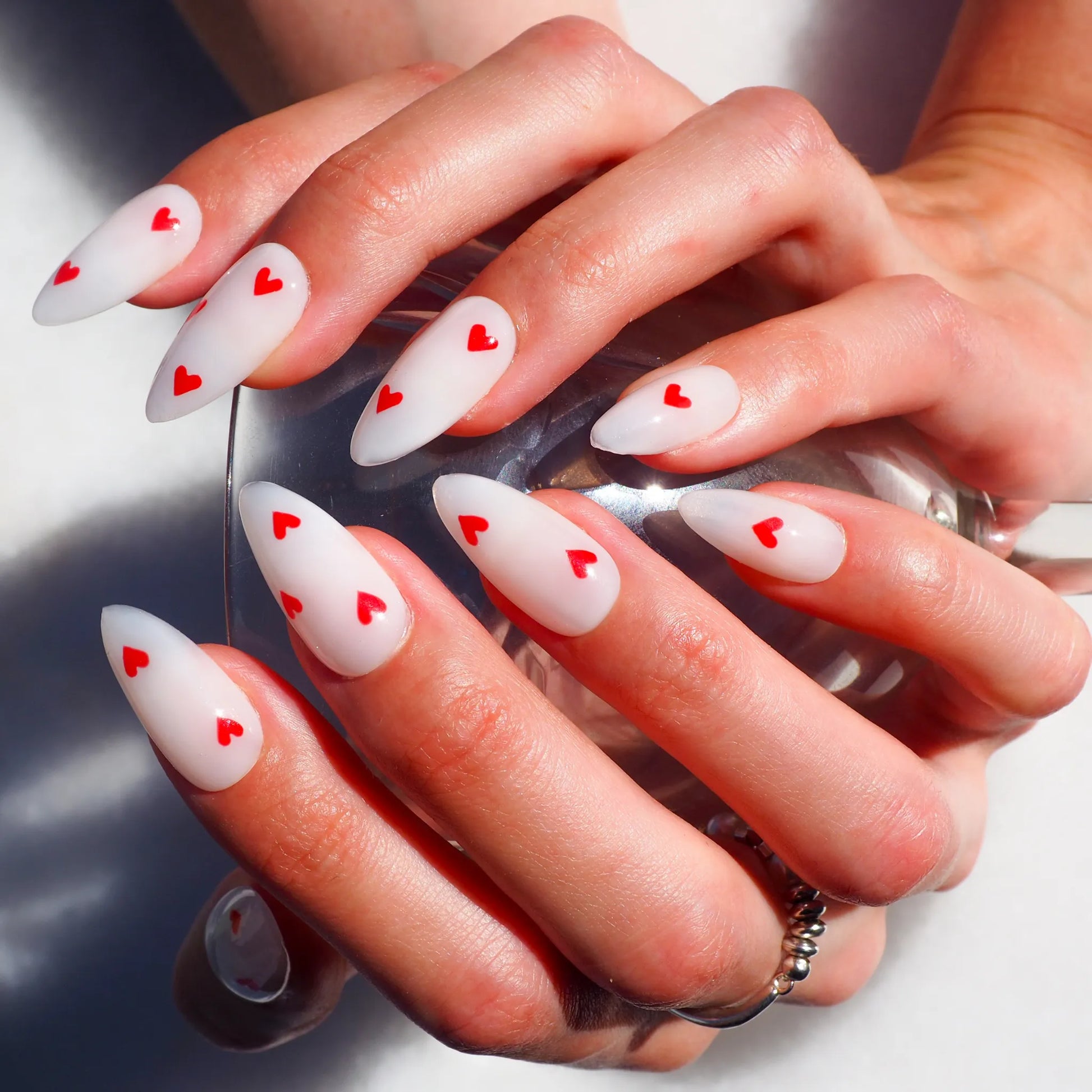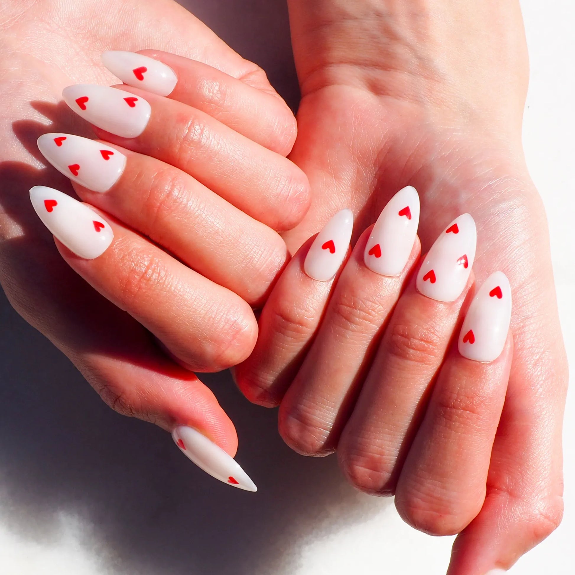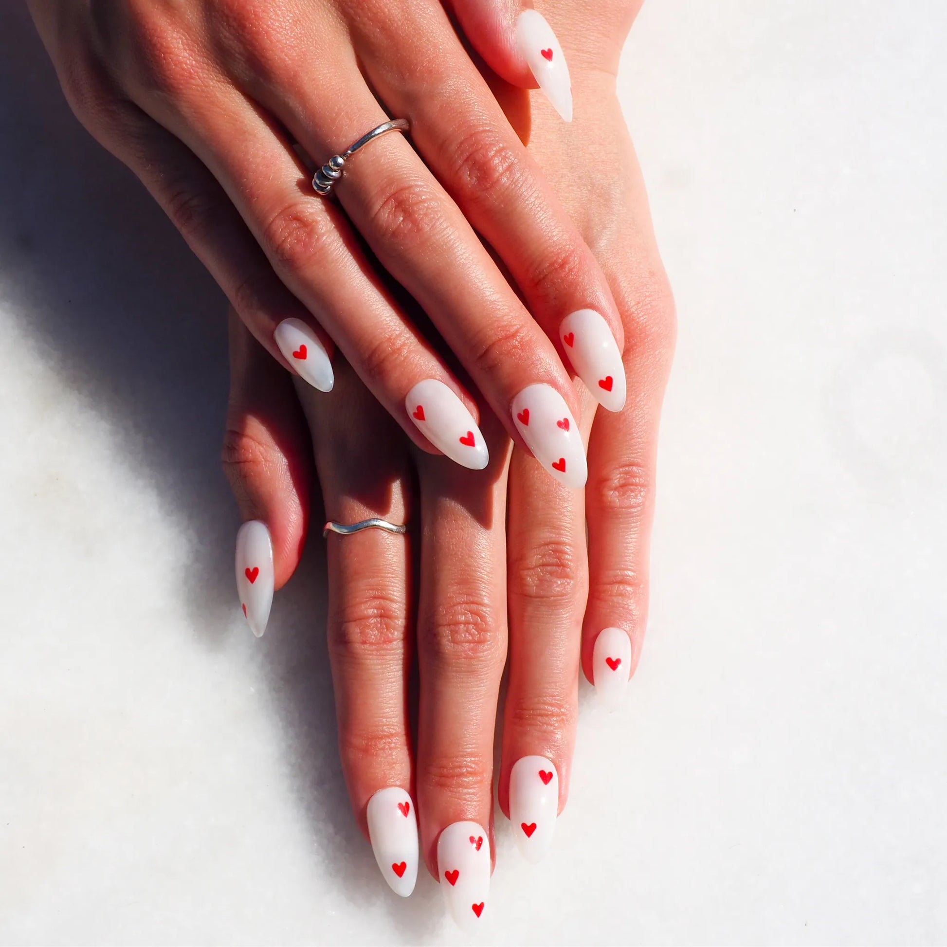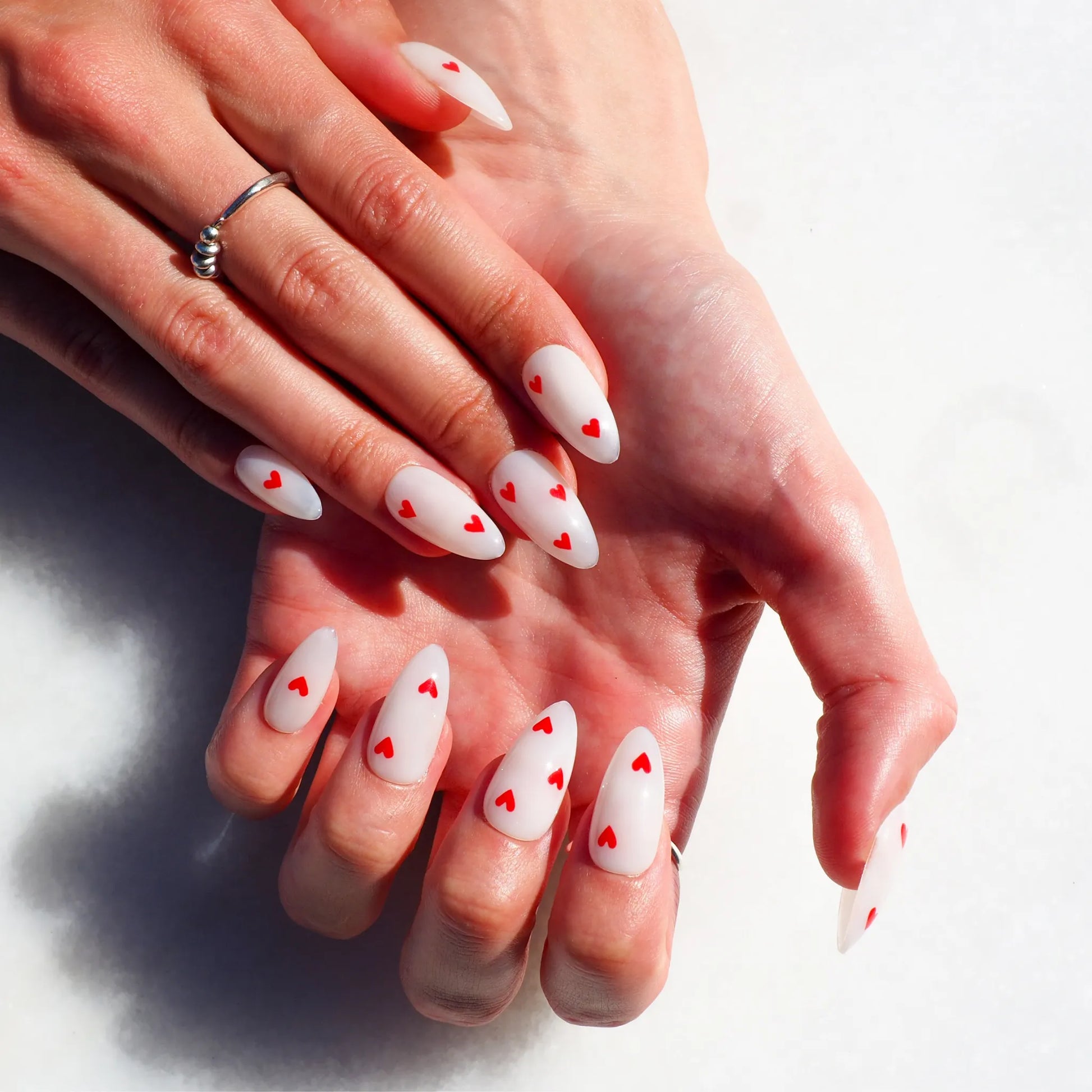 Faux ongles press-on faits main sur base blanche, ornés de cœurs rouges éclatants. Un design romantique et audacieux, parfait pour apporter une touche originale et séduisante à ta manucure.