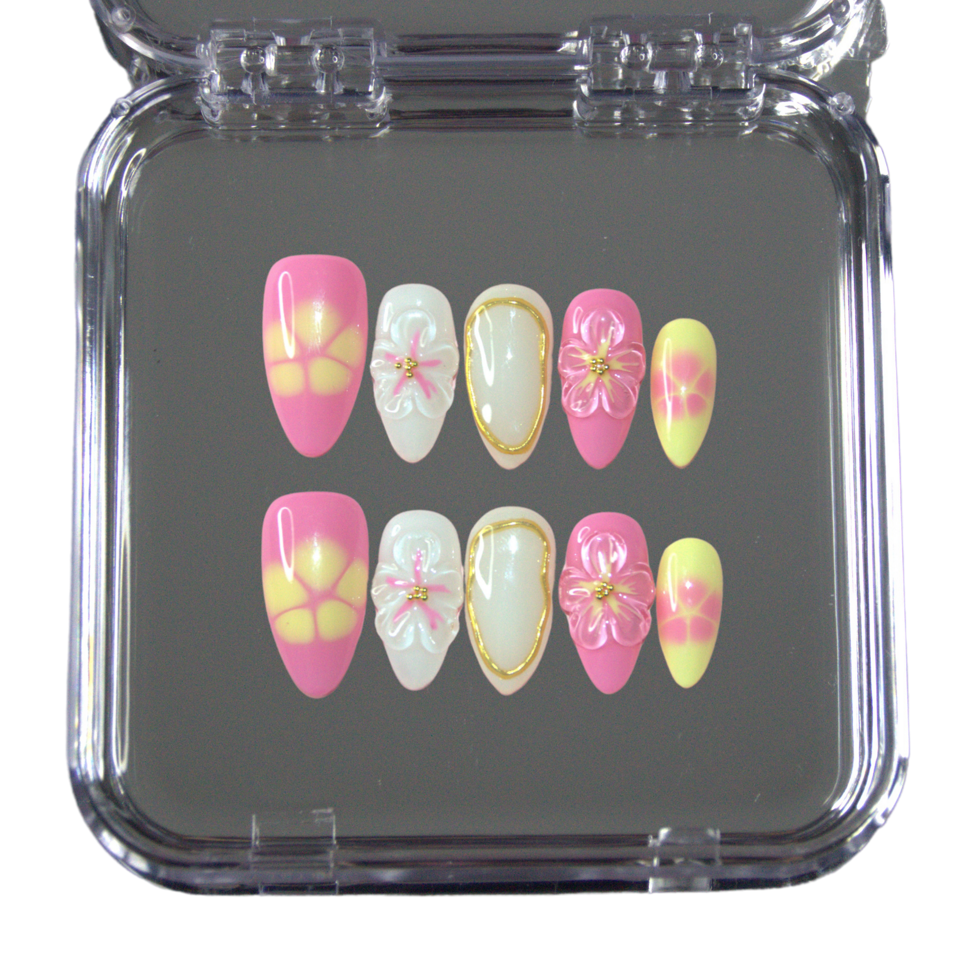 Faux ongles press-on faits main en rose, blanc et jaune, ornés de fleurs 3D et de contours dorés. Un design éclatant et raffiné qui apporte une touche ensoleillée et élégante à la manucure.