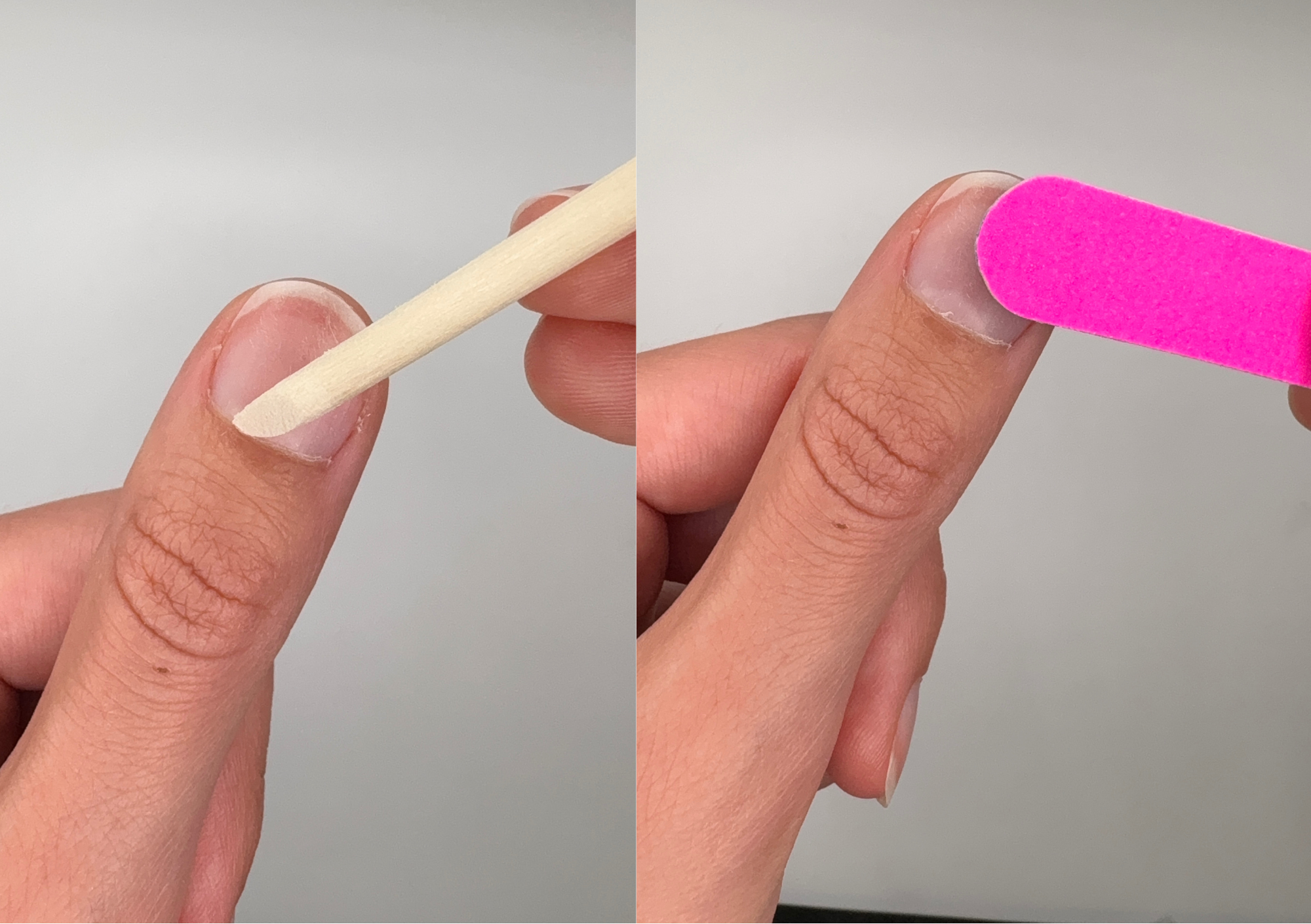 Avec le bâtonnet, repousse tes cuticules et lime toute la surface de ton ongle.
