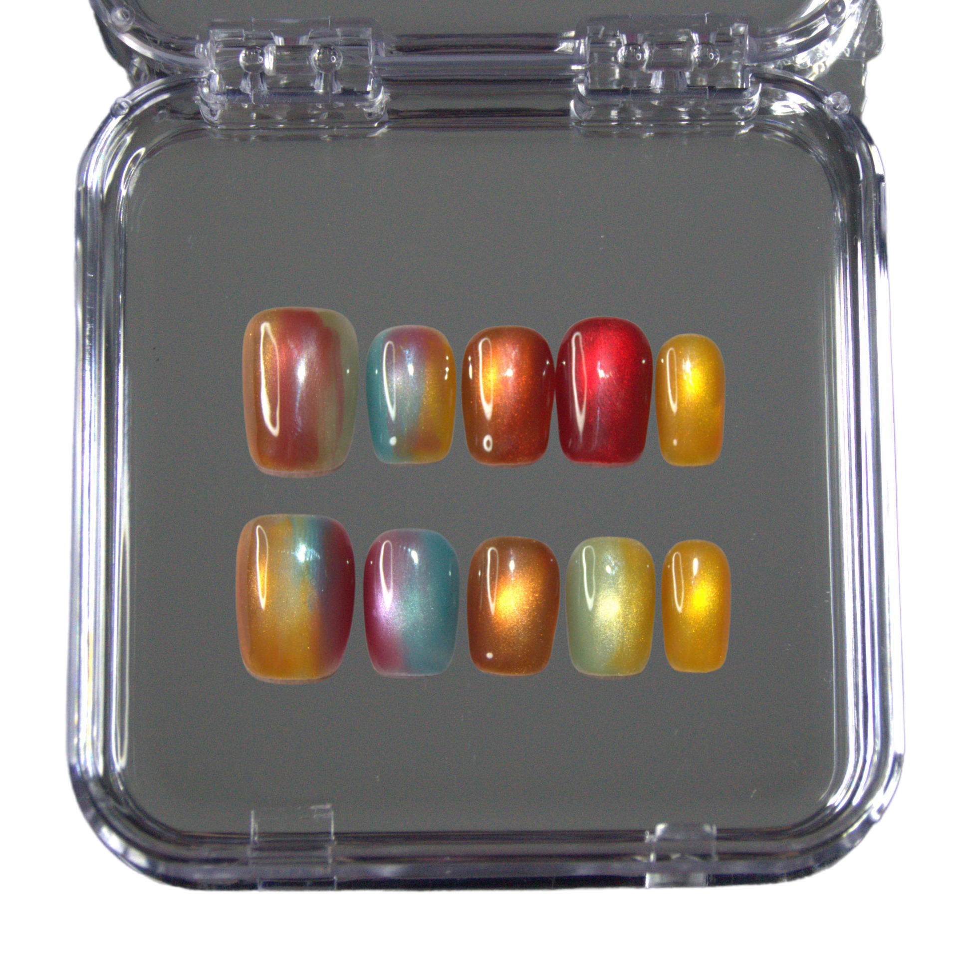 Faux ongles press-on faits main multicolores. Dégradé de rose, vert, jaune et bleu pour un effet lumineux et unique.