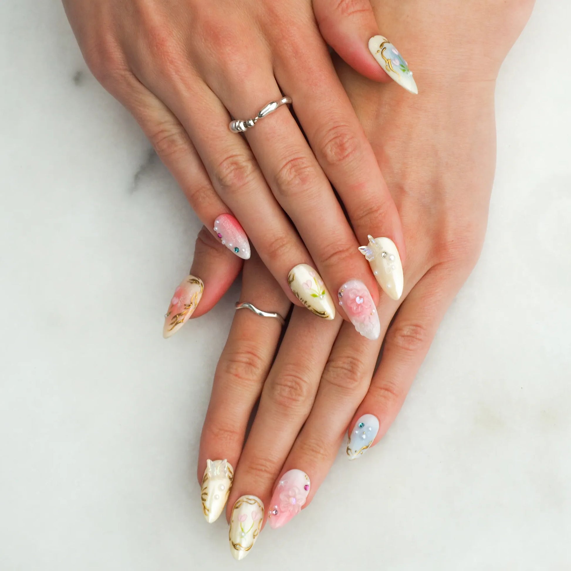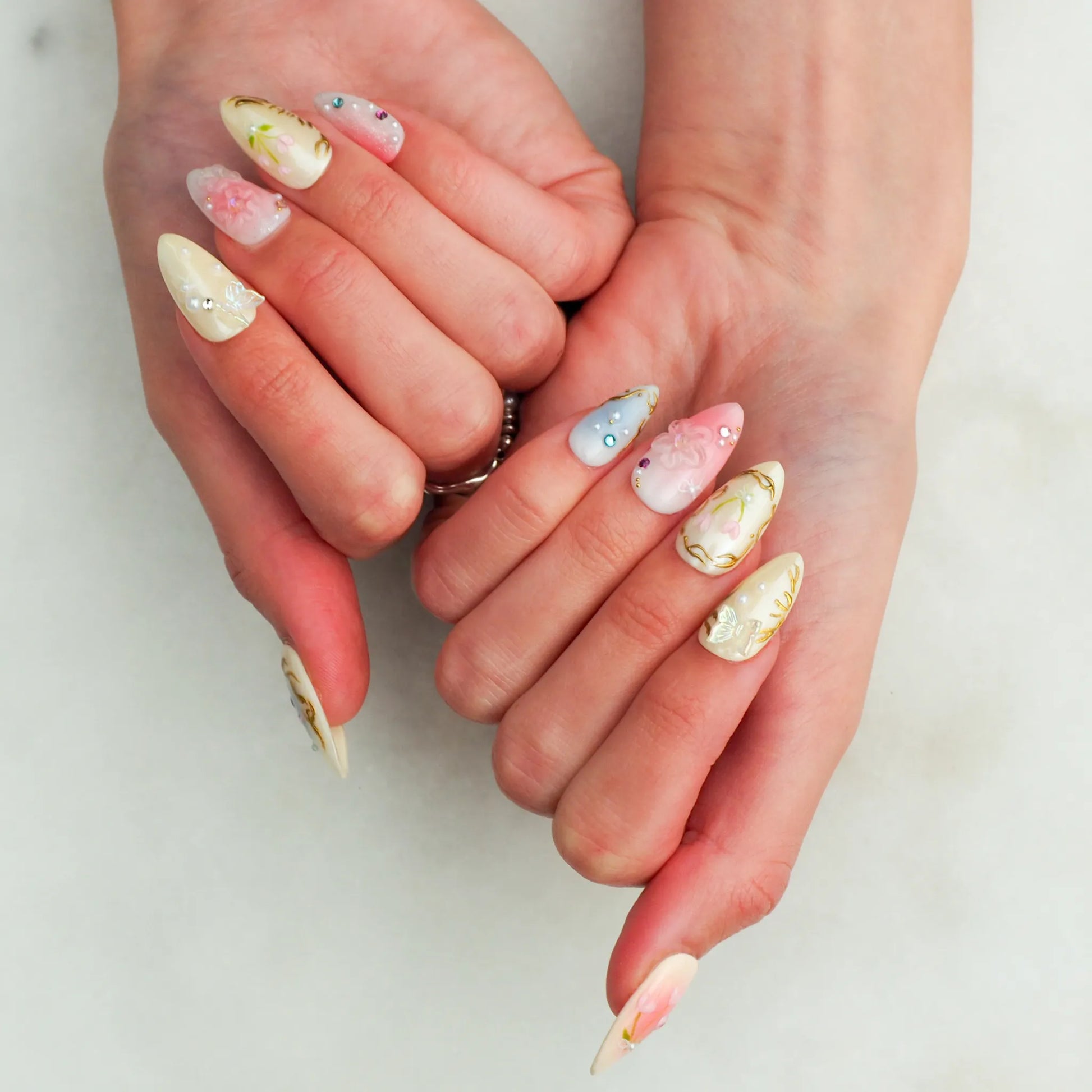Faux ongles press-on faits main aux tons beige et rose, ornés de motifs floraux délicats et de détails 3D. Un design raffiné et romantique inspiré d’un jardin en fleurs.